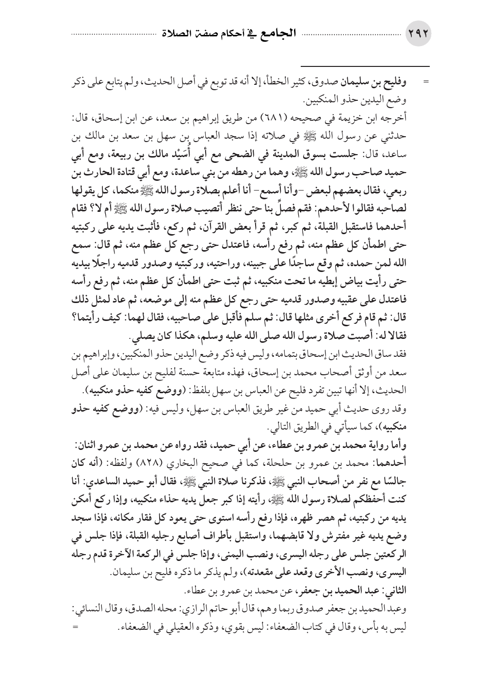 أخرجه ابن خزيمة في صحيحه (٦٨١) من طريق إبراهيم بن سعد، عن ابن إسحاق، قال: حدثني عن رسول الله - صلى الله عليه وسلم - في صلاته إذا سجد العباس بن سهل بن سعد بن مالك بن ساعد، قال: جلست بسوق المدينة في الضحى مع أبي أُسَيْد مالك بن ربيعة، ومع أبي حميد صاحب رسول الله - صلى الله عليه وسلم -، وهما من رهطه من بني ساعدة، ومع أبي قتادة الحارث بن ربعي، فقال بعضهم لبعض -وأنا أسمع- أنا أعلم بصلاة رسول الله - صلى الله عليه وسلم - منكما، كل يقولها لصاحبه فقالوا لأحدهم: فقم فصلِّ بنا حتى ننظر أتصيب صلاة رسول الله - صلى الله عليه وسلم - أم لا؟ فقام أحدهما فاستقبل القبلة، ثم كبر، ثم قرأ بعض القرآن، ثم ركع، فأثبت يديه على ركبتيه حتى اطمأن كل عظم منه، ثم رفع رأسه، فاعتدل حتى رجع كل عظم منه، ثم قال: سمع الله لمن حمده، ثم وقع ساجدًا على جبينه، وراحتيه، وركبتيه وصدور قدميه راجلًا بيديه حتى رأيت بياض إبطيه ما تحت منكبيه، ثم ثبت حتى اطمأن كل عظم منه، ثم رفع رأسه فاعتدل على عقبيه وصدور قدميه حتى رجع كل عظم منه إلى موضعه، ثم عاد لمثل ذلك قال: ثم قام فركع أخرى مثلها قال: ثم سلم فأقبل على صاحبيه، فقال لهما: كيف رأيتما؟ فقالا له: أصبت صلاة رسول الله صلى الله عليه وسلم، هكذا كان يصلي.