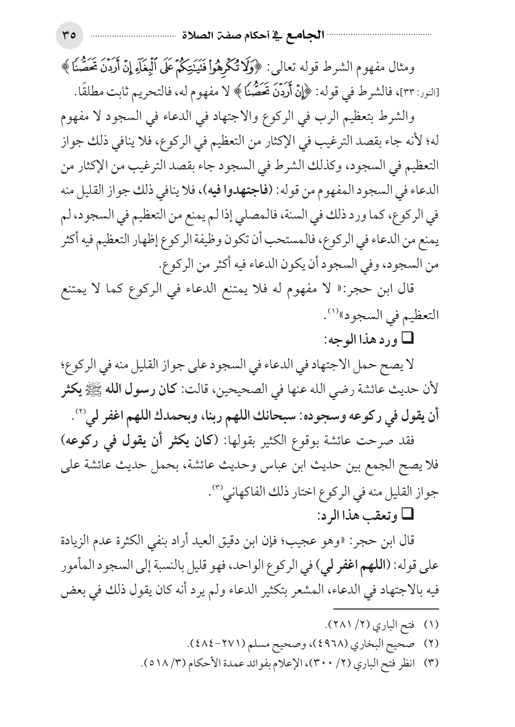 فقد صرحت عائشة بوقوع الكثير بقولها: (كان يكثر أن يقول في ركوعه) فلا يصح الجمع بين حديث ابن عباس وحديث عائشة، بحمل حديث عائشة على جواز القليل منه في الركوع اختار ذلك الفاكهاني (¬٣).