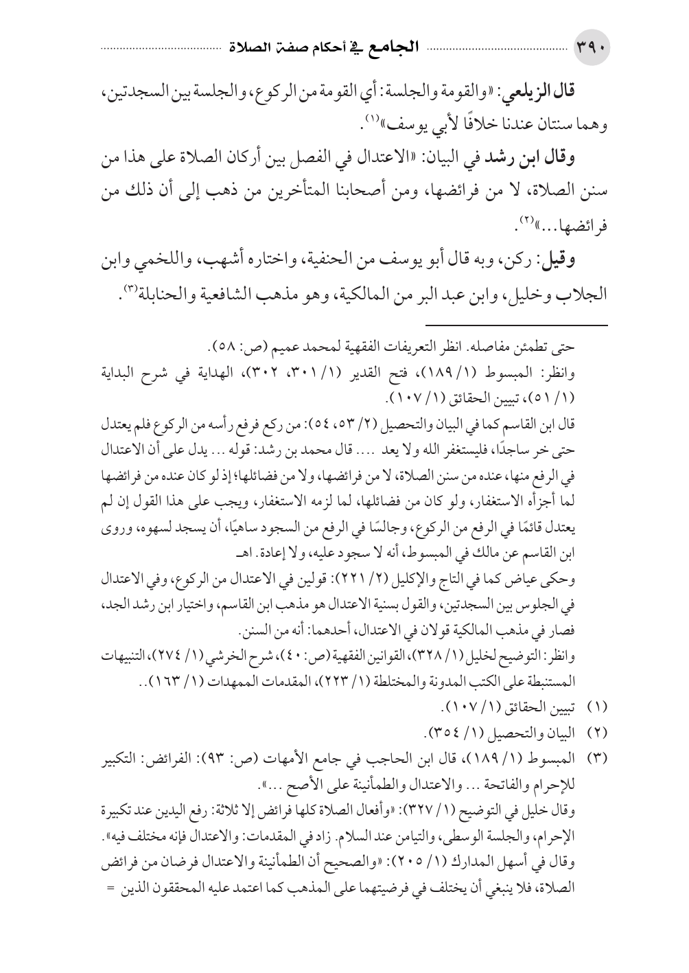 وقال ابن رشد في البيان: «الاعتدال في الفصل بين أركان الصلاة على هذا من سنن الصلاة، لا من فرائضها، ومن أصحابنا المتأخرين من ذهب إلى أن ذلك من فرائضها ... » (¬٢).