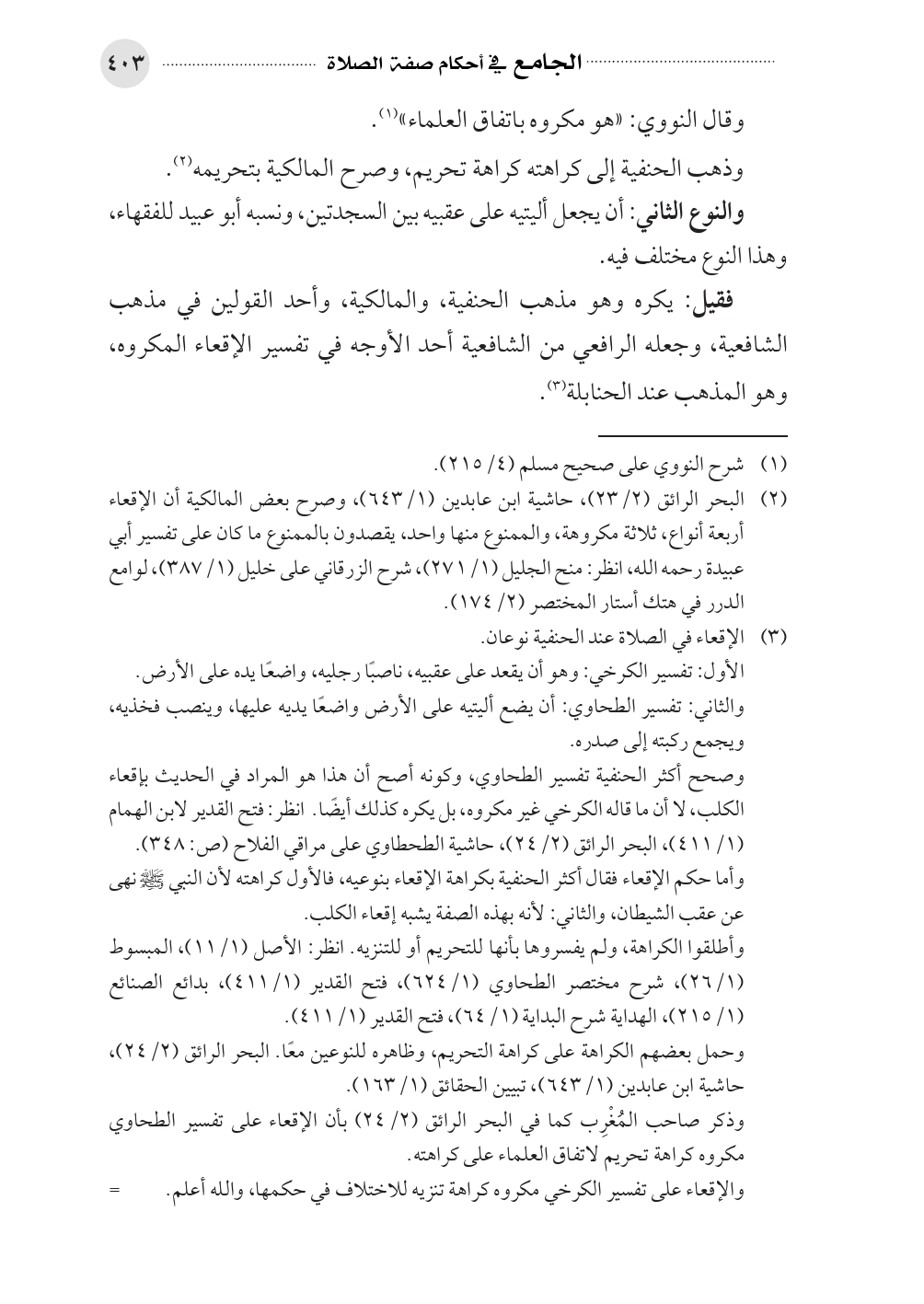 (¬٢). البحر الرائق (٢/ ٢٣)، حاشية ابن عابدين (١/ ٦٤٣)، وصرح بعض المالكية أن الإقعاء أربعة أنواع، ثلاثة مكروهة، والممنوع منها واحد، يقصدون بالممنوع ما كان على تفسير أبي عبيدة رحمه الله، انظر: منح الجليل (١/ ٢٧١)، شرح الزرقاني على خليل (١/ ٣٨٧)، لوامع الدرر في هتك أستار المختصر (٢/ ١٧٤).