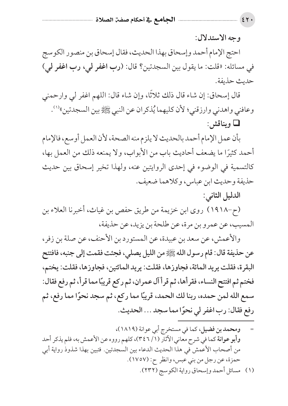احتج الإمام أحمد وإسحاق بهذا الحديث، فقال إسحاق بن منصور الكوسج في مسائله: «قلت: ما يقول بين السجدتين؟ قال: (رب اغفر لي، رب اغفر لي) حديث حذيفة.