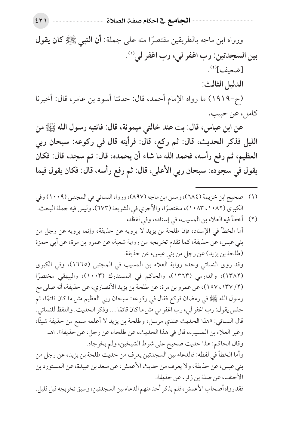 وأما الخطأ في لفظه: فالدعاء بين السجدتين يعرف من حديث طلحة بن يزيد، عن رجل من بني عبس، عن حذيفة، ولا يعرف من حديث الأعمش، عن سعد بن عبيدة، عن المستورد بن الأحنف، عن صلة بن زفر، عن حذيفة.