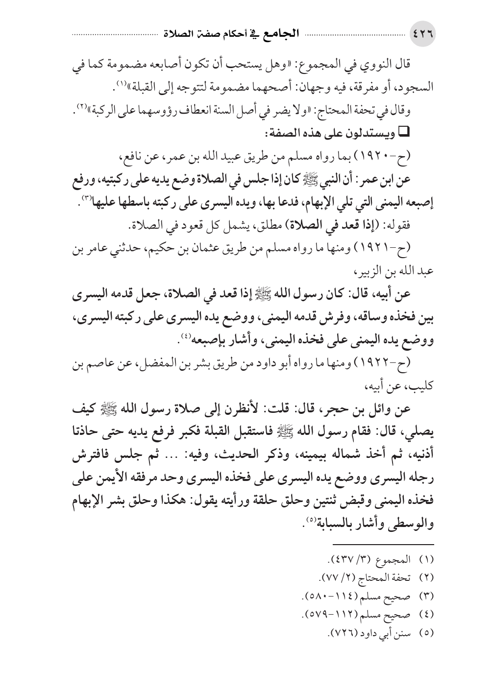 قال النووي في المجموع: «وهل يستحب أن تكون أصابعه مضمومة كما في السجود، أو مفرقة، فيه وجهان: أصحهما مضمومة لتتوجه إلى القبلة» (¬١).