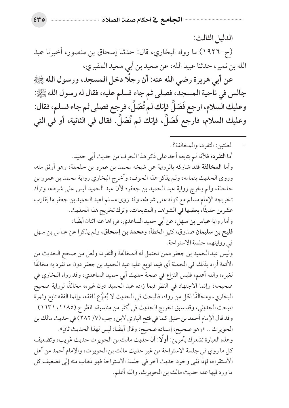 وليس عبد الحميد بن جعفر ممن تحتمل له المخالفة والتفرد، ولعل من صحح الحديث من الأئمة أراد بذلك في الجملة أي فيما توبع عليه عبد الحميد بن جعفر دون ما تفرد به مخالفًا لغيره، والله أعلم، فليس النزاع في صحة حديث أبي حميد الساعدي، وقد رواه البخاري في صحيحه، وإنما الاجتهاد في النظر فيما زاده عبد الحميد دون غيره، مخالفًا لرواية صحيح البخاري، ومخالفًا لكل من رواه، فالبحث في الحديث لا يُطوَّع للفقه، وإنما الفقه تابع وثمرة للبحث الحديثي، وقد سبق تخريج الحديث في أكثر من مناسبة، انظر ح (١١٨٥، ١٦٣١).