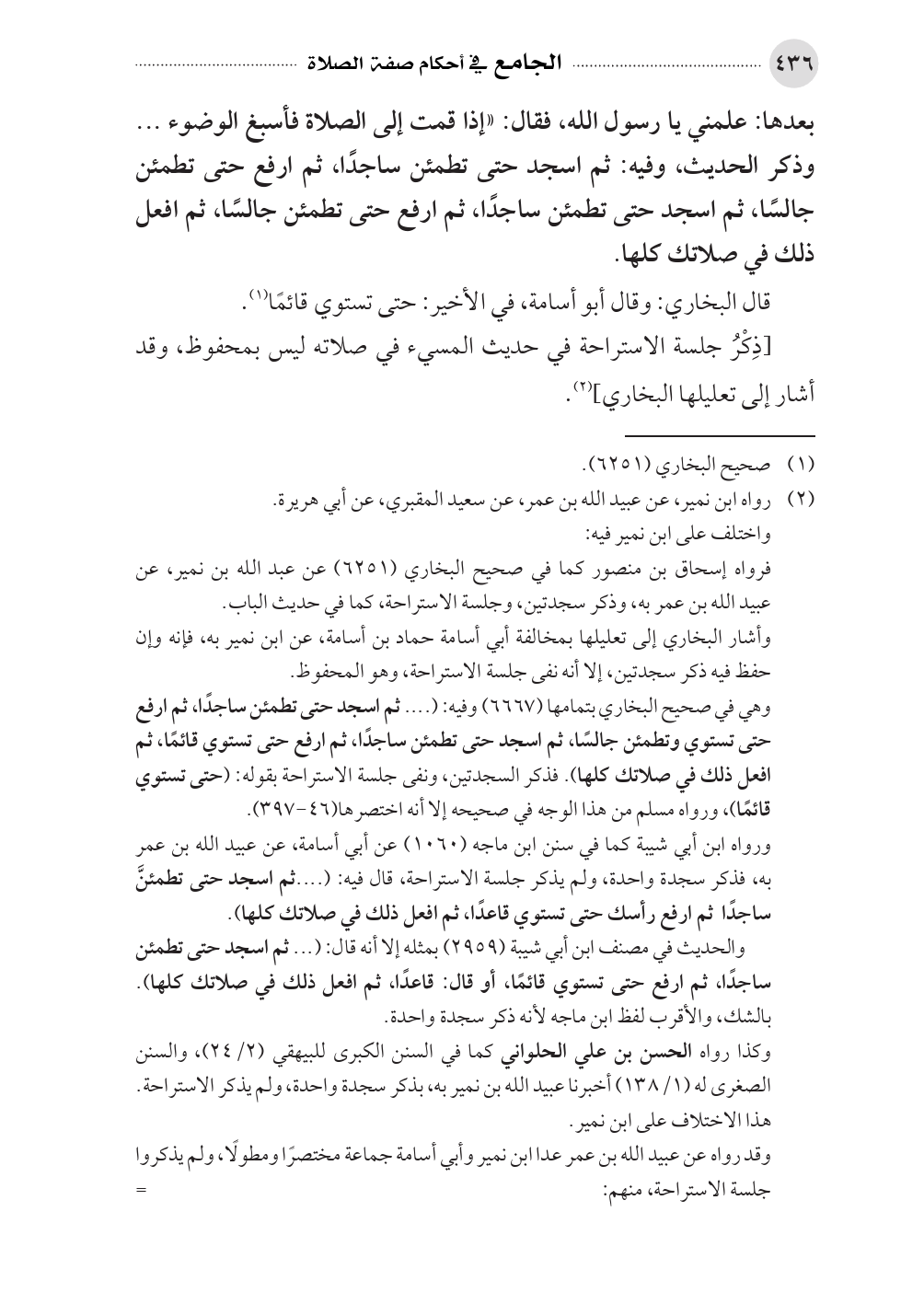 وأشار البخاري إلى تعليلها بمخالفة أبي أسامة حماد بن أسامة، عن ابن نمير به، فإنه وإن حفظ فيه ذكر سجدتين، إلا أنه نفى جلسة الاستراحة، وهو المحفوظ.