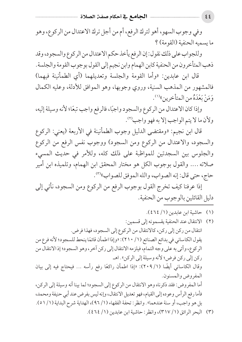 وللجواب على ذلك نقول: إن الرفع يأخذ حكم الاعتدال من الركوع والسجود، وقد ذهب المتأخرون من الحنفية كابن الهمام وابن نجيم إلى القول بوجوب القومة والجلسة.