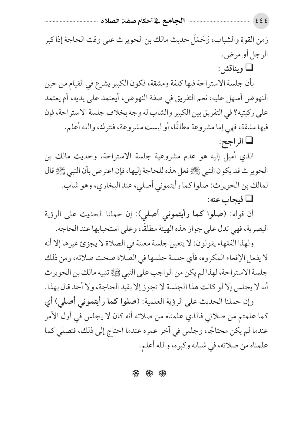 الذي أميل إليه هو عدم مشروعية جلسة الاستراحة، وحديث مالك بن الحويرث قد يكون النبي - صلى الله عليه وسلم - فعل هذه للحاجة إليها، فإن اعترض بأن النبي - صلى الله عليه وسلم - قال لمالك بن الحويرث: صلوا كما رأيتموني أصلي، عند البخاري، وهو شاب.