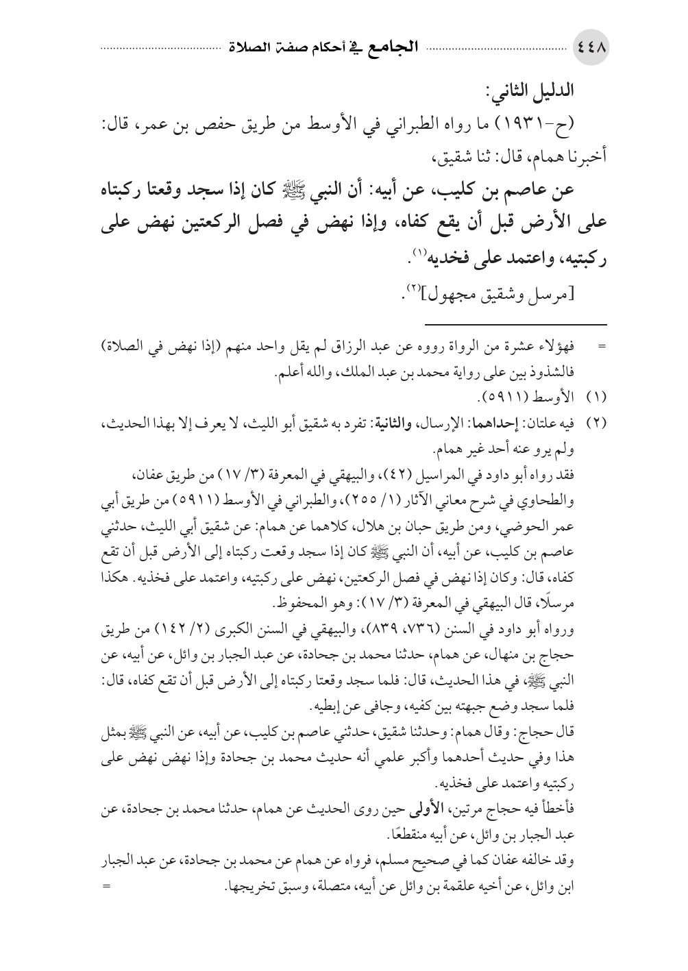 قال حجاج: وقال همام: وحدثنا شقيق، حدثني عاصم بن كليب، عن أبيه، عن النبي - صلى الله عليه وسلم - بمثل هذا وفي حديث أحدهما وأكبر علمي أنه حديث محمد بن جحادة وإذا نهض نهض على ركبتيه واعتمد على فخذيه.