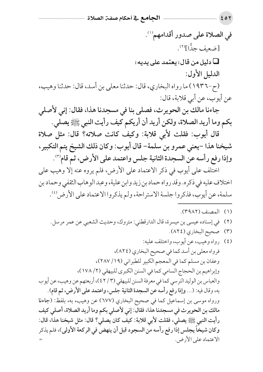 ورواه موسى بن إسماعيل كما في صحيح البخاري (٦٧٧) عن وهيب، به، بلفظ: (جاءنا مالك بن الحويرث في مسجدنا هذا، فقال: إني لأصلي بكم وما أريد الصلاة، أصلي كيف رأيت النبي - صلى الله عليه وسلم - يصلي، فقلت لأبي قلابة: كيف كان يصلي؟ قال: مثل شيخنا هذا، قال: وكان شيخاً يجلس إذا رفع رأسه من السجود قبل أن ينهض في الركعة الأولى)، فلم يذكر الاعتماد على الأرض. =