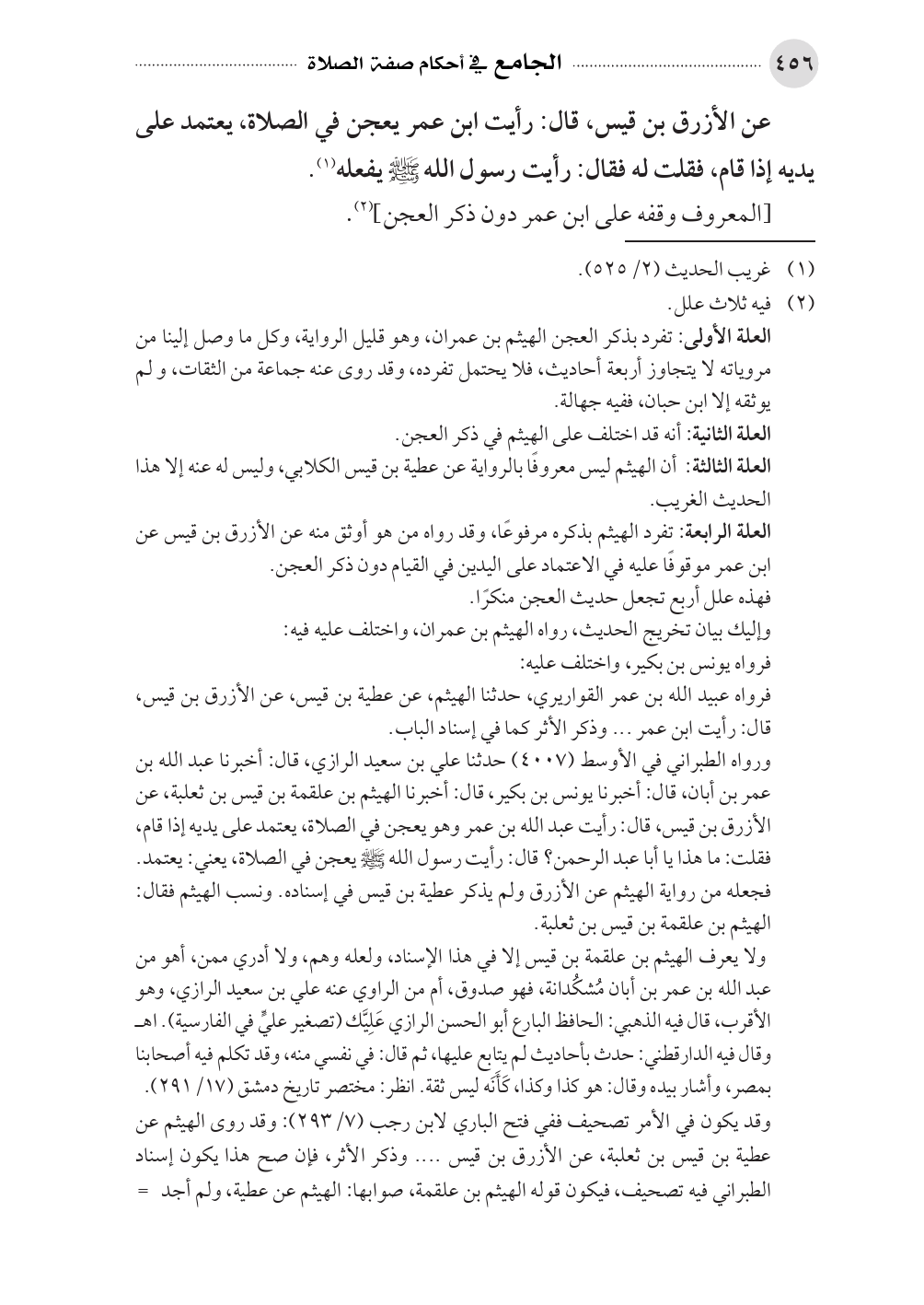 ورواه الطبراني في الأوسط (٤٠٠٧) حدثنا علي بن سعيد الرازي، قال: أخبرنا عبد الله بن عمر بن أبان، قال: أخبرنا يونس بن بكير، قال: أخبرنا الهيثم بن علقمة بن قيس بن ثعلبة، عن الأزرق بن قيس، قال: رأيت عبد الله بن عمر وهو يعجن في الصلاة، يعتمد على يديه إذا قام، فقلت: ما هذا يا أبا عبد الرحمن؟ قال: رأيت رسول الله - صلى الله عليه وسلم - يعجن في الصلاة، يعني: يعتمد.