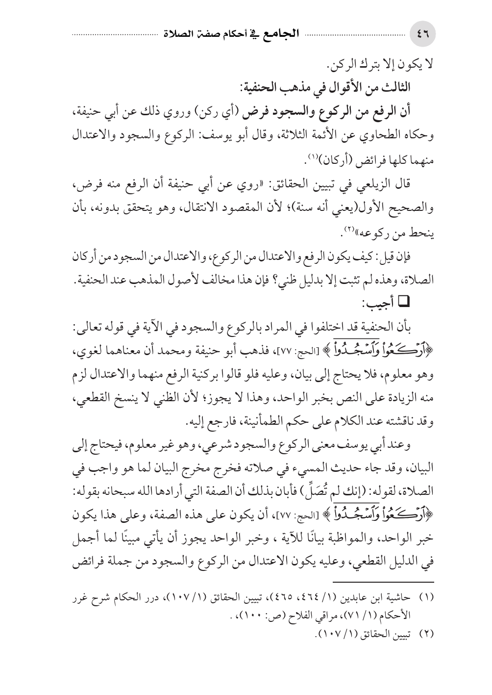 بأن الحنفية قد اختلفوا في المراد بالركوع والسجود في الآية في قوله تعالى: {ارْكَعُوا وَاسْجُدُوا} [الحج: ٧٧]، فذهب أبو حنيفة ومحمد أن معناهما لغوي، وهو معلوم، فلا يحتاج إلى بيان، وعليه فلو قالوا بركنية الرفع منهما والاعتدال لزم منه الزيادة على النص بخبر الواحد، وهذا لا يجوز؛ لأن الظني لا ينسخ القطعي، وقد ناقشته عند الكلام على حكم الطمأنينة، فارجع إليه.