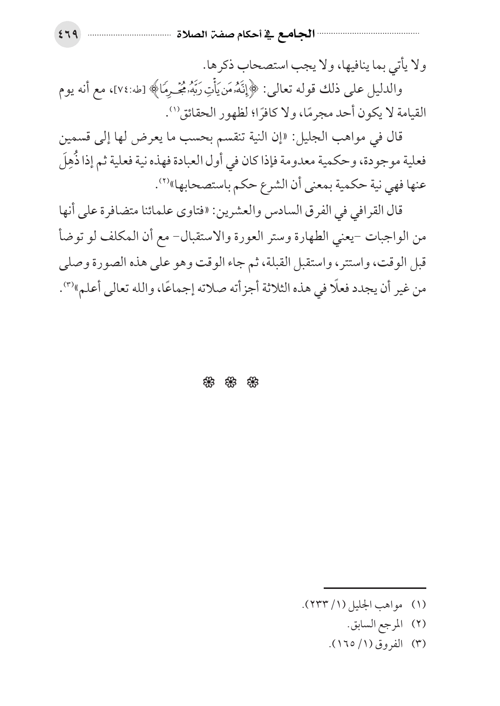 قال القرافي في الفرق السادس والعشرين: «فتاوى علمائنا متضافرة على أنها من الواجبات -يعني الطهارة وستر العورة والاستقبال- مع أن المكلف لو توضأ قبل الوقت، واستتر، واستقبل القبلة، ثم جاء الوقت وهو على هذه الصورة وصلى من غير أن يجدد فعلًا في هذه الثلاثة أجزأته صلاته إجماعًا، والله تعالى أعلم» (¬٣).