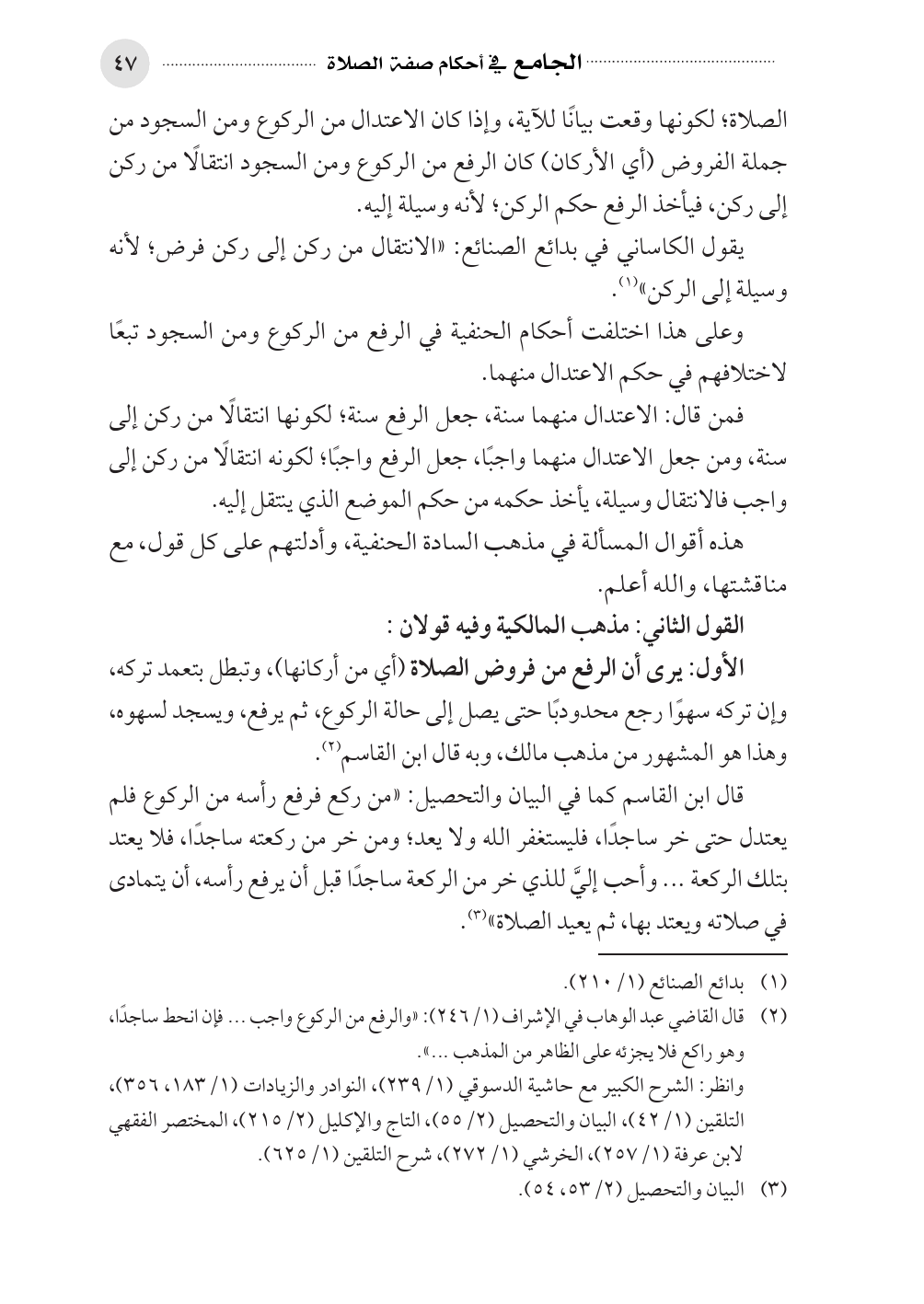 الأول: يرى أن الرفع من فروض الصلاة (أي من أركانها)، وتبطل بتعمد تركه، وإن تركه سهوًا رجع محدودبًا حتى يصل إلى حالة الركوع، ثم يرفع، ويسجد لسهوه، وهذا هو المشهور من مذهب مالك، وبه قال ابن القاسم (¬٢).