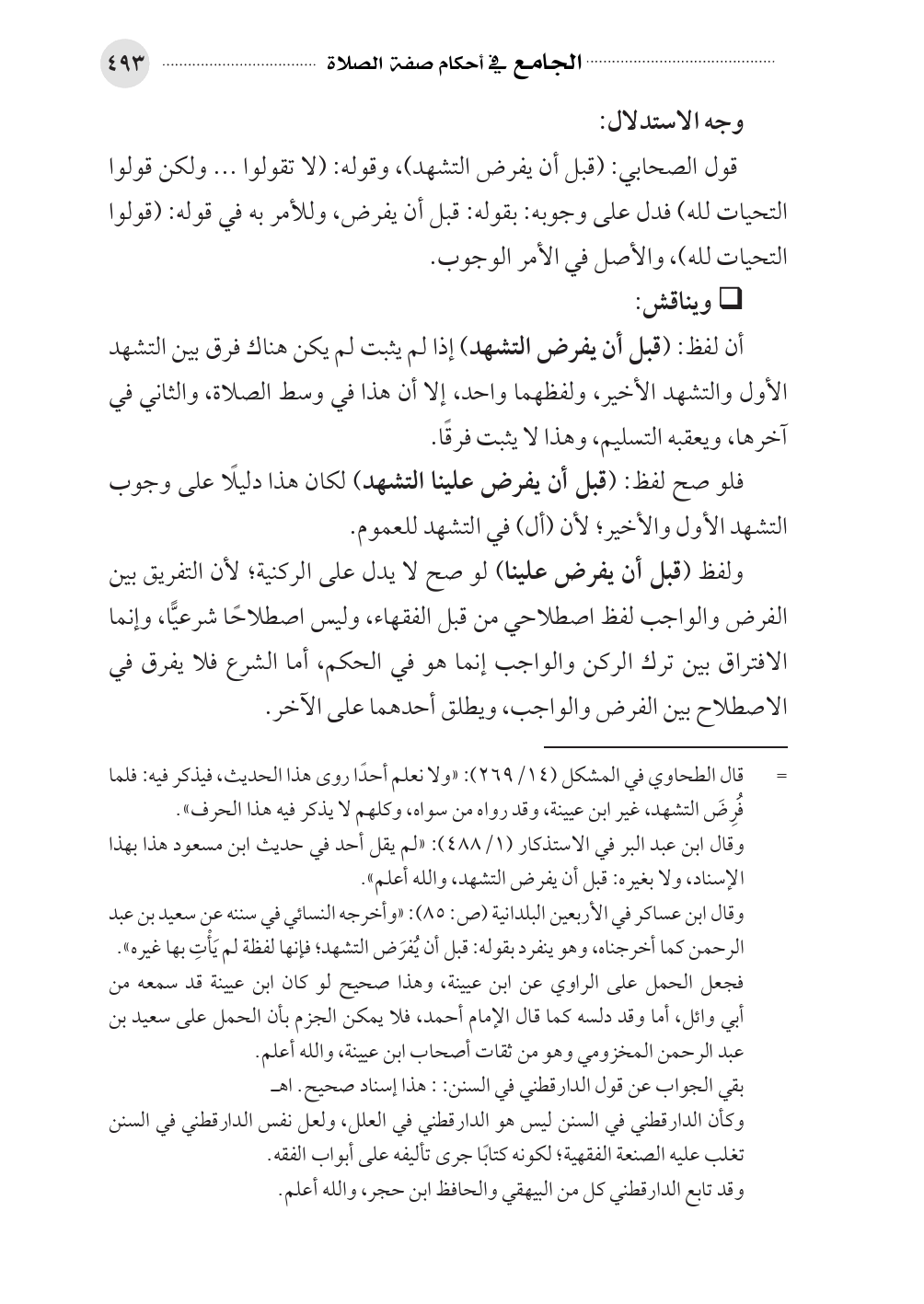 فلو صح لفظ: (قبل أن يفرض علينا التشهد) لكان هذا دليلًا على وجوب التشهد الأول والأخير؛ لأن (أل) في التشهد للعموم.