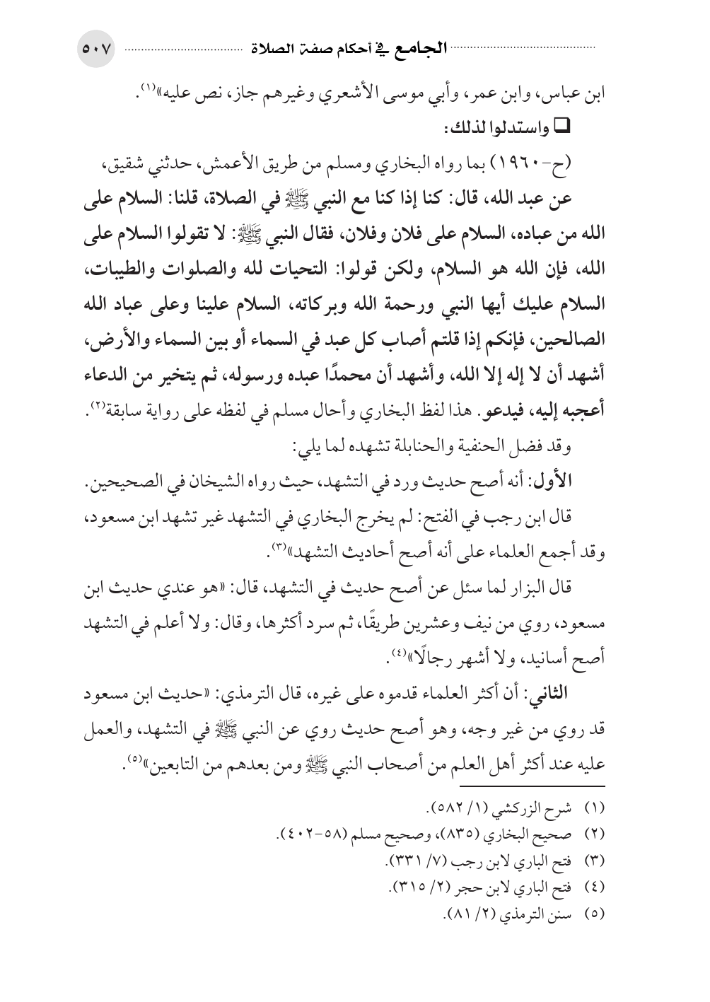 الثاني: أن أكثر العلماء قدموه على غيره، قال الترمذي: «حديث ابن مسعود قد روي من غير وجه، وهو أصح حديث روي عن النبي - صلى الله عليه وسلم - في التشهد، والعمل عليه عند أكثر أهل العلم من أصحاب النبي - صلى الله عليه وسلم - ومن بعدهم من التابعين» (¬٥).