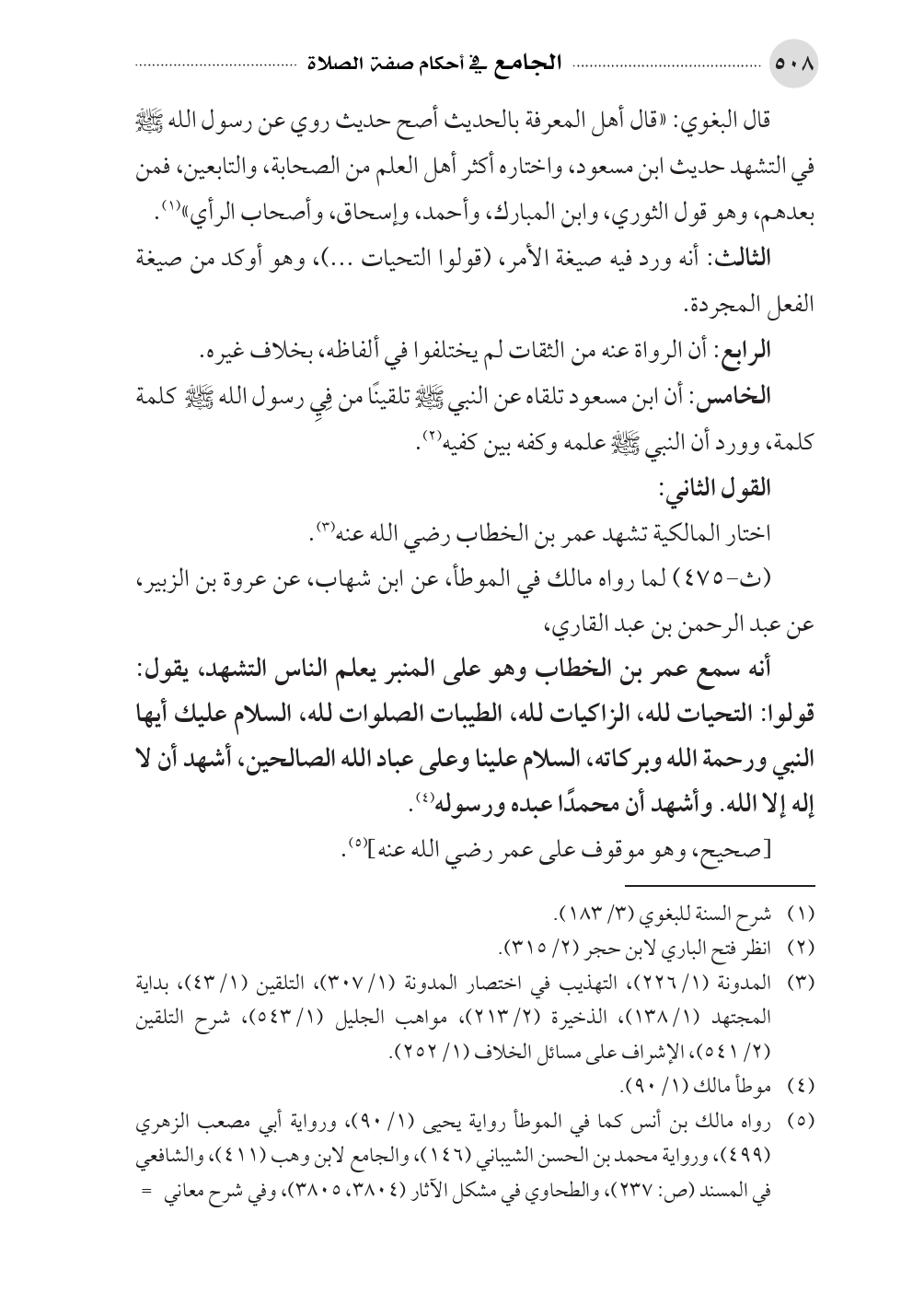 قال البغوي: «قال أهل المعرفة بالحديث أصح حديث روي عن رسول الله - صلى الله عليه وسلم - في التشهد حديث ابن مسعود، واختاره أكثر أهل العلم من الصحابة، والتابعين، فمن بعدهم، وهو قول الثوري، وابن المبارك، وأحمد، وإسحاق، وأصحاب الرأي» (¬١).