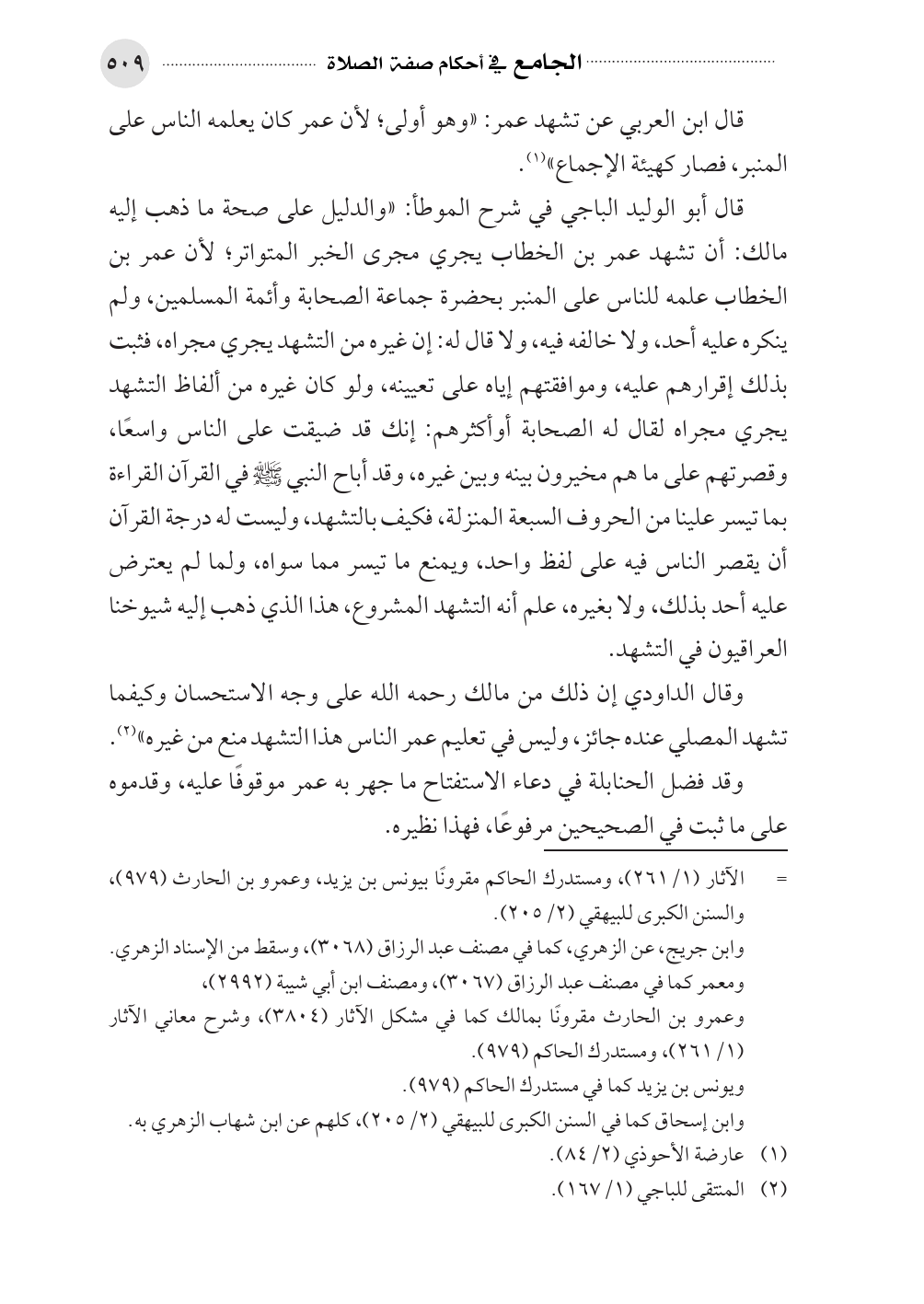 قال أبو الوليد الباجي في شرح الموطأ: «والدليل على صحة ما ذهب إليه مالك: أن تشهد عمر بن الخطاب يجري مجرى الخبر المتواتر؛ لأن عمر بن الخطاب علمه للناس على المنبر بحضرة جماعة الصحابة وأئمة المسلمين، ولم ينكره عليه أحد، ولا خالفه فيه، ولا قال له: إن غيره من التشهد يجري مجراه، فثبت بذلك إقرارهم عليه، وموافقتهم إياه على تعيينه، ولو كان غيره من ألفاظ التشهد يجري مجراه لقال له الصحابة أوأكثرهم: إنك قد ضيقت على الناس واسعًا، وقصرتهم على ما هم مخيرون بينه وبين غيره، وقد أباح النبي - صلى الله عليه وسلم - في القرآن القراءة بما تيسر علينا من الحروف السبعة المنزلة، فكيف بالتشهد، وليست له درجة القرآن أن يقصر الناس فيه على لفظ واحد، ويمنع ما تيسر مما سواه، ولما لم يعترض عليه أحد بذلك، ولا بغيره، علم أنه التشهد المشروع، هذا الذي ذهب إليه شيوخنا العراقيون في التشهد.