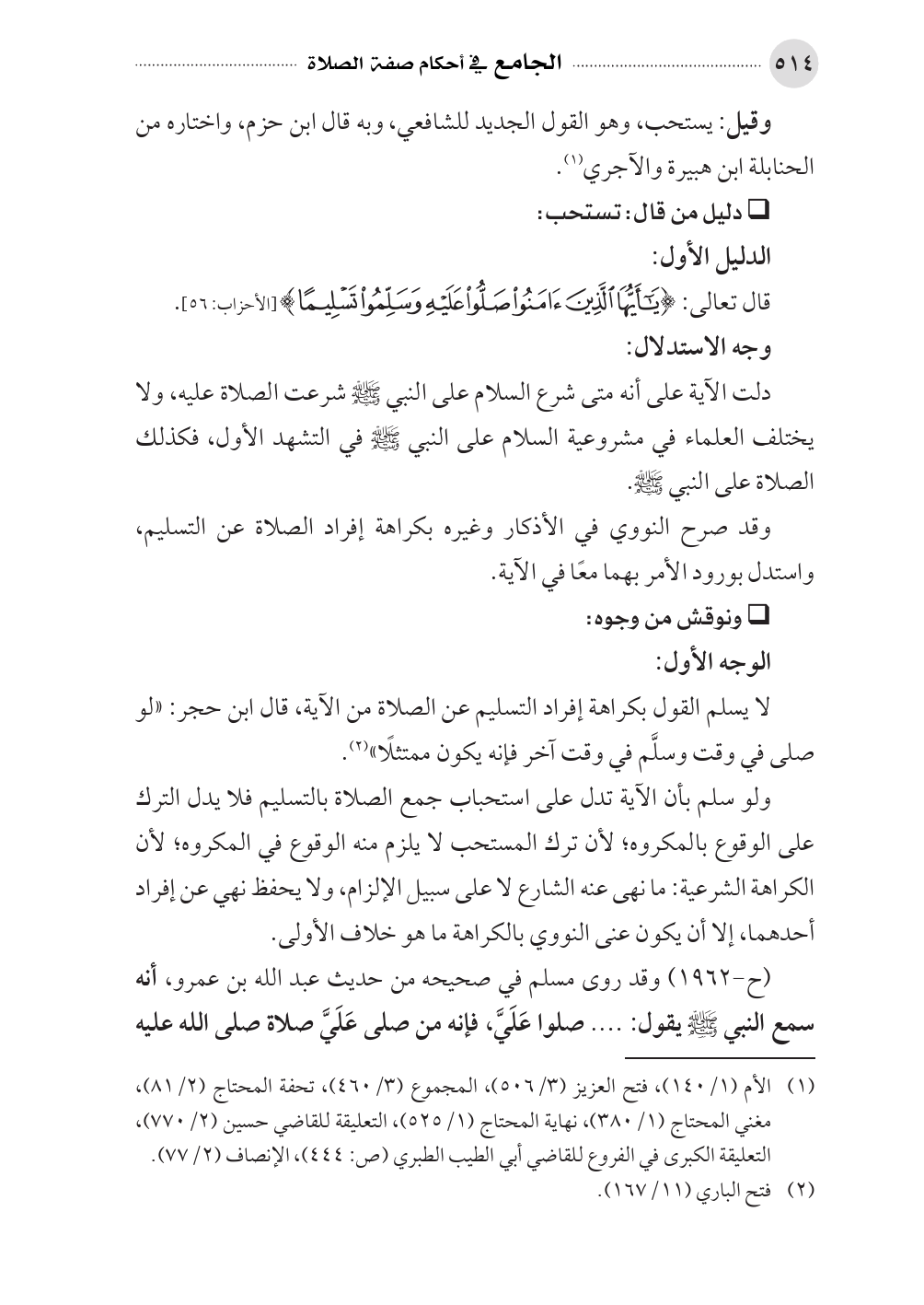 ولو سلم بأن الآية تدل على استحباب جمع الصلاة بالتسليم فلا يدل الترك على الوقوع بالمكروه؛ لأن ترك المستحب لا يلزم منه الوقوع في المكروه؛ لأن الكراهة الشرعية: ما نهى عنه الشارع لا على سبيل الإلزام، ولا يحفظ نهي عن إفراد أحدهما، إلا أن يكون عنى النووي بالكراهة ما هو خلاف الأولى.