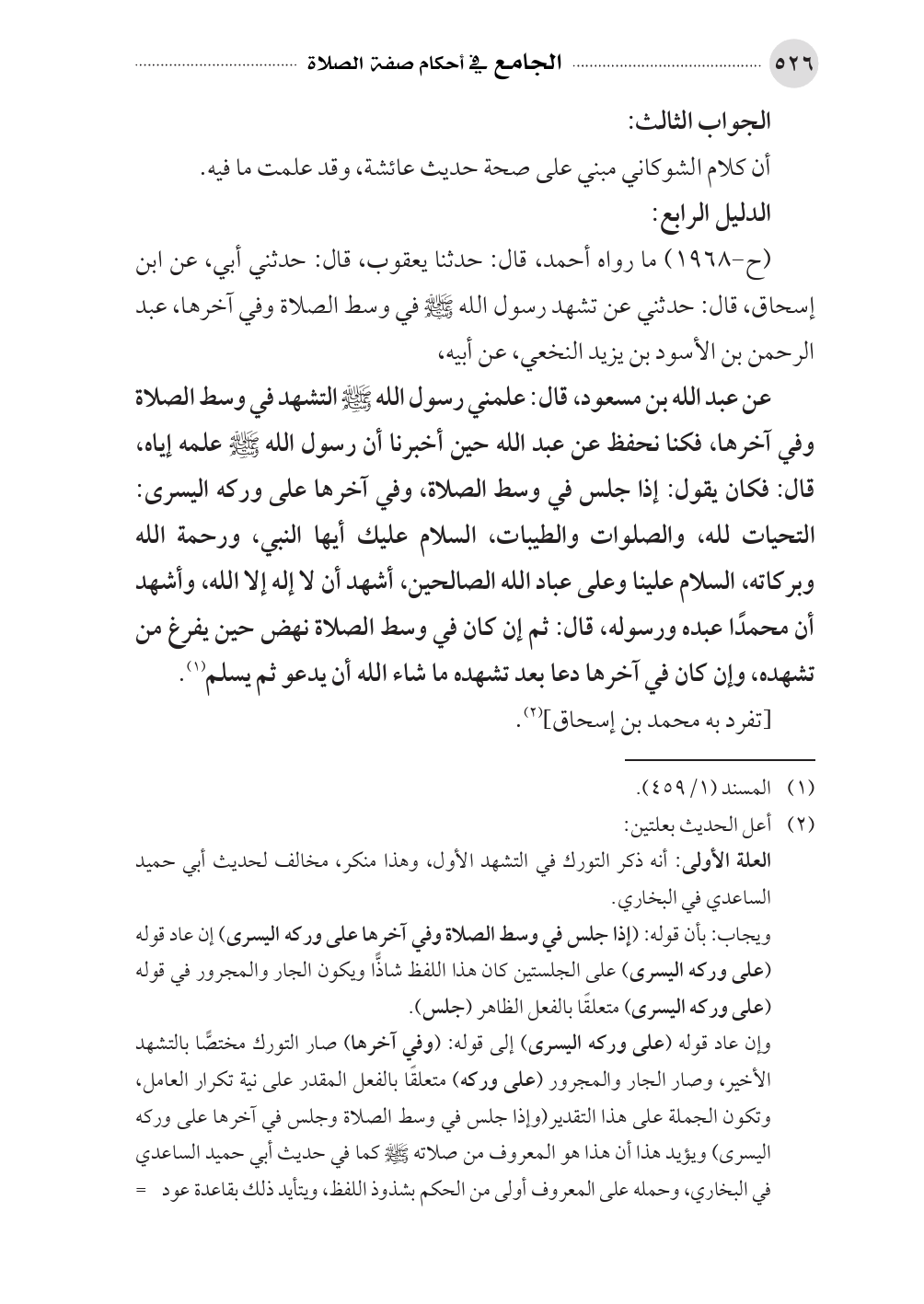 (ح-١٩٦٨) ما رواه أحمد، قال: حدثنا يعقوب، قال: حدثني أبي، عن ابن إسحاق، قال: حدثني عن تشهد رسول الله - صلى الله عليه وسلم - في وسط الصلاة وفي آخرها، عبد الرحمن بن الأسود بن يزيد النخعي، عن أبيه،