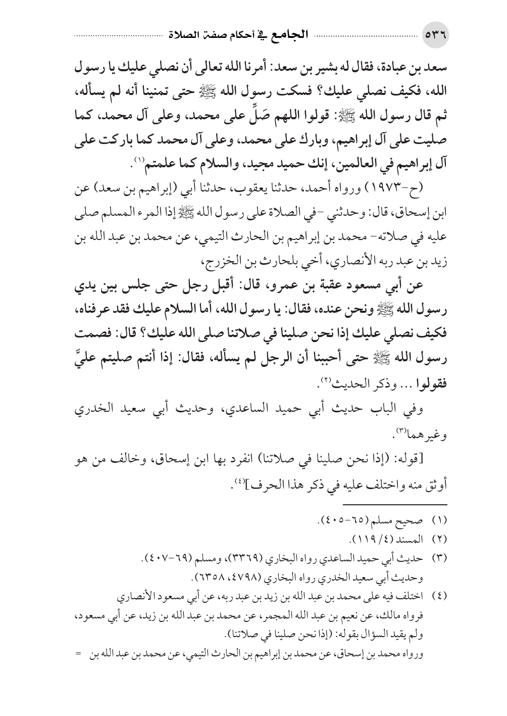 سعد بن عبادة، فقال له بشير بن سعد: أمرنا الله تعالى أن نصلي عليك يا رسول الله، فكيف نصلي عليك؟ فسكت رسول الله - صلى الله عليه وسلم - حتى تمنينا أنه لم يسأله، ثم قال رسول الله - صلى الله عليه وسلم -: قولوا اللهم صَلِّ على محمد، وعلى آل محمد، كما صليت على آل إبراهيم، وبارك على محمد، وعلى آل محمد كما باركت على آل إبراهيم في العالمين، إنك حميد مجيد، والسلام كما علمتم (¬١).