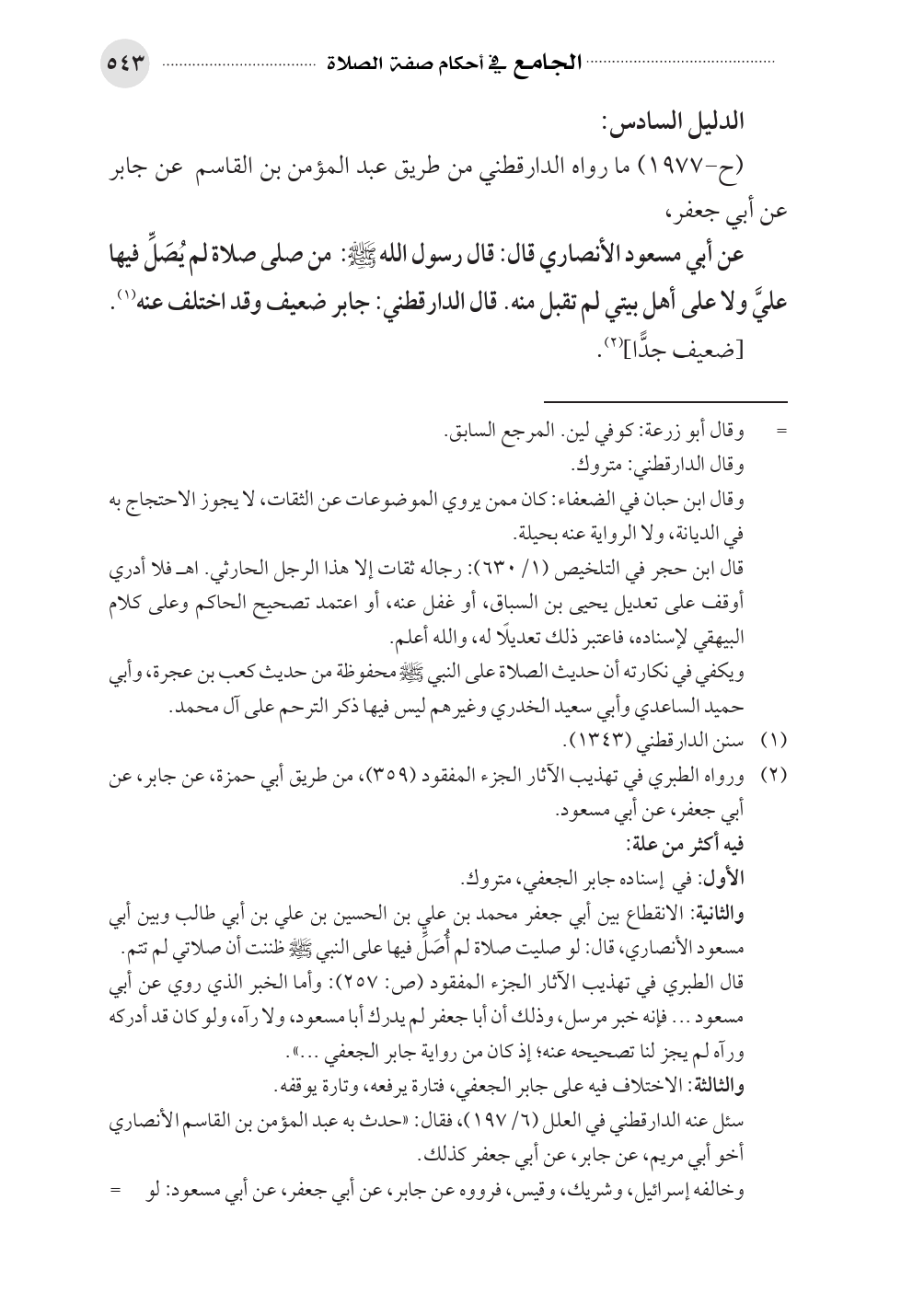 عن أبي مسعود الأنصاري قال: قال رسول الله - صلى الله عليه وسلم -: من صلى صلاة لم يُصَلِّ فيها عليَّ ولا على أهل بيتي لم تقبل منه. قال الدارقطني: جابر ضعيف وقد اختلف عنه (¬١).