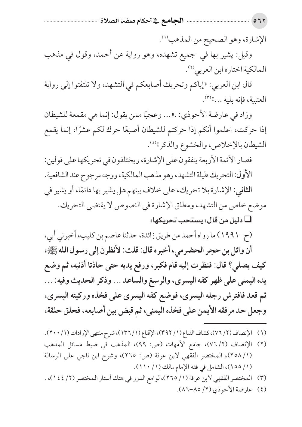 الثاني: الإشارة بلا تحريك، على خلاف بينهم هل يشير بها دائمًا، أو يشير في موضع خاص من التشهد، ومطلق الإشارة في النصوص لا يقتضي التحريك.