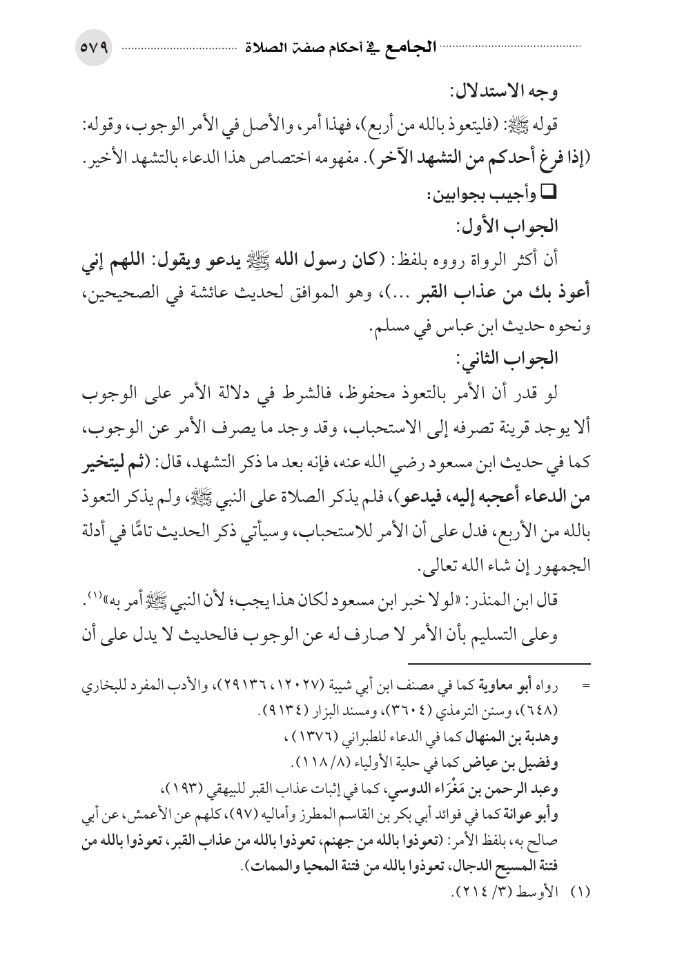 لو قدر أن الأمر بالتعوذ محفوظ، فالشرط في دلالة الأمر على الوجوب ألا يوجد قرينة تصرفه إلى الاستحباب، وقد وجد ما يصرف الأمر عن الوجوب، كما في حديث ابن مسعود رضي الله عنه، فإنه بعد ما ذكر التشهد، قال: (ثم ليتخير من الدعاء أعجبه إليه، فيدعو)، فلم يذكر الصلاة على النبي - صلى الله عليه وسلم -، ولم يذكر التعوذ بالله من الأربع، فدل على أن الأمر للاستحباب، وسيأتي ذكر الحديث تامًّا في أدلة الجمهور إن شاء الله تعالى.