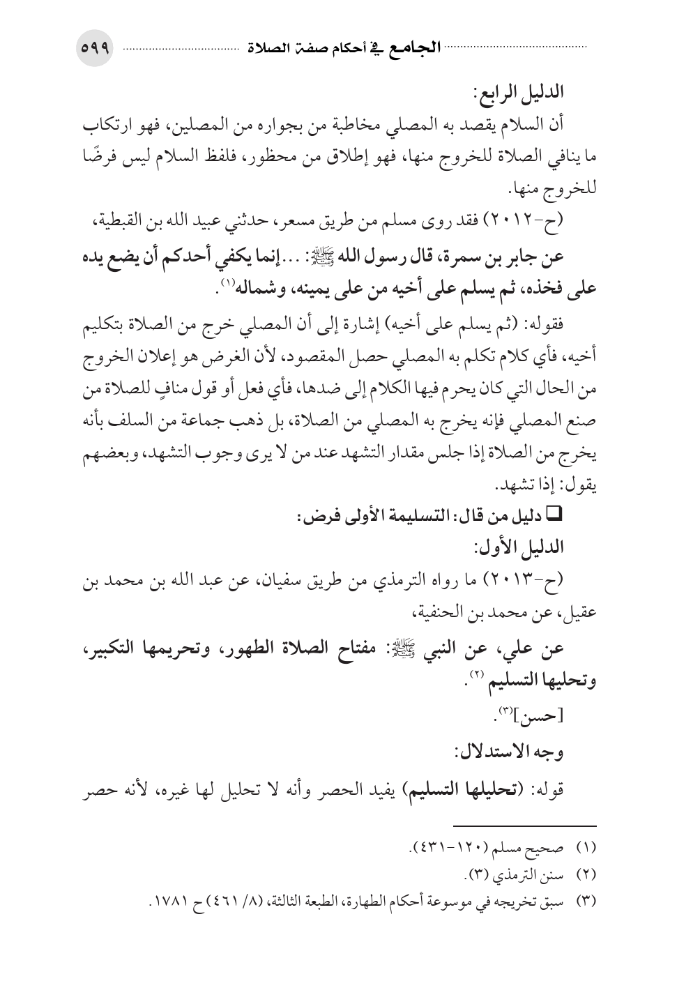 قوله: (تحليلها التسليم) يفيد الحصر وأنه لا تحليل لها غيره، لأنه حصر