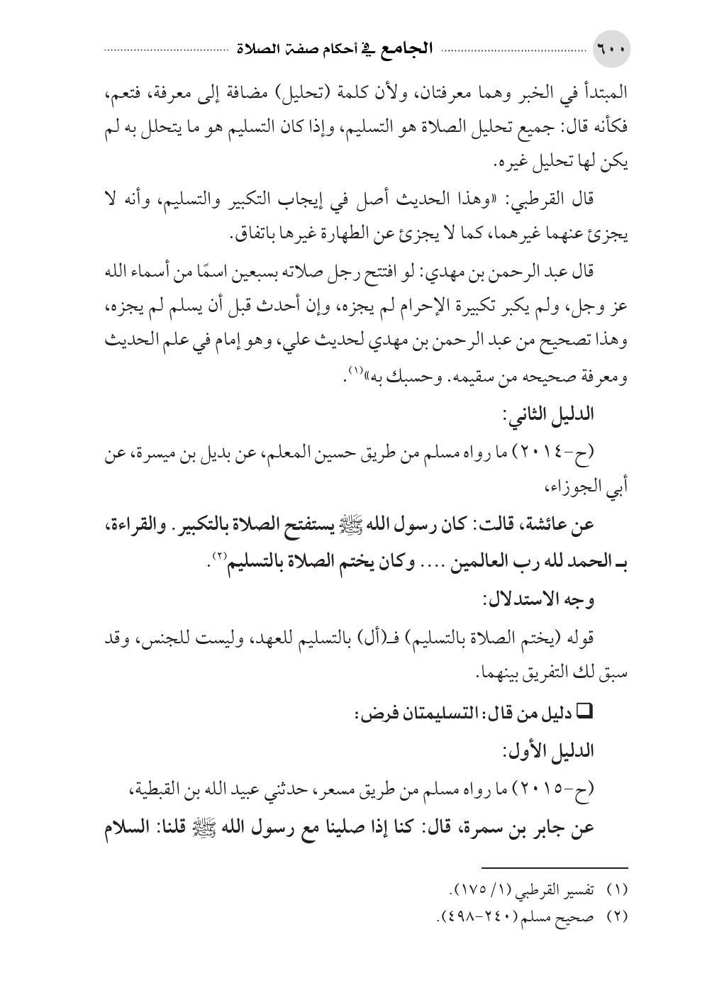 المبتدأ في الخبر وهما معرفتان، ولأن كلمة (تحليل) مضافة إلى معرفة، فتعم، فكأنه قال: جميع تحليل الصلاة هو التسليم، وإذا كان التسليم هو ما يتحلل به لم يكن لها تحليل غيره.
