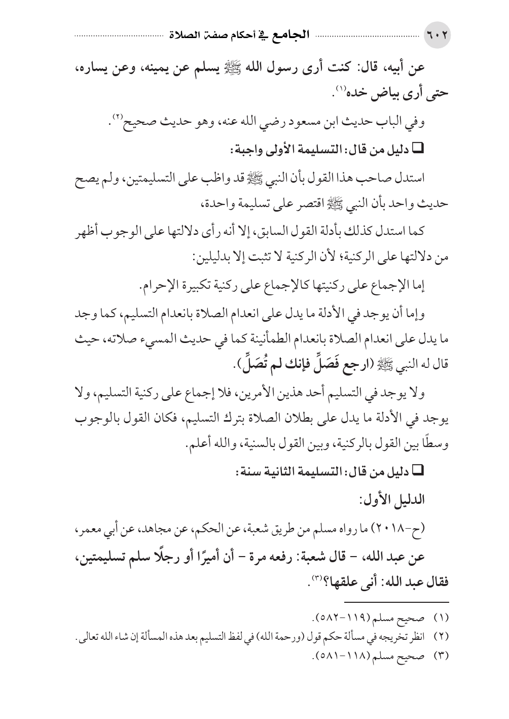 (¬٢). انظر تخريجه في مسألة حكم قول (ورحمة الله) في لفظ التسليم بعد هذه المسألة إن شاء الله تعالى.
