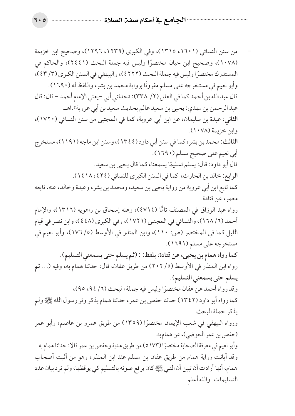 رواه ابن المنذر في الأوسط (٥/ ٢٠٢) من طريق عفان، قال: حدثنا همام به، وفيه ( ... ثم يسلم حتى يسمعني التسليم).