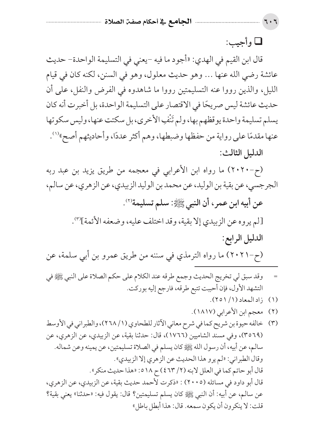 قال ابن القيم في الهدي: «أجود ما فيه -يعني في التسليمة الواحدة- حديث عائشة رضي الله عنها ... وهو حديث معلول، وهو في السنن، لكنه كان في قيام الليل، والذين رووا عنه التسليمتين رووا ما شاهدوه في الفرض والنفل، على أن حديث عائشة ليس صريحًا في الاقتصار على التسليمة الواحدة، بل أخبرت أنه كان يسلم تسليمة واحدة يوقظهم بها، ولم تَنْفِ الأخرى، بل سكتت عنها، وليس سكوتها عنها مقدمًا على رواية من حفظها وضبطها، وهم أكثر عددًا، وأحاديثهم أصح» (¬١).