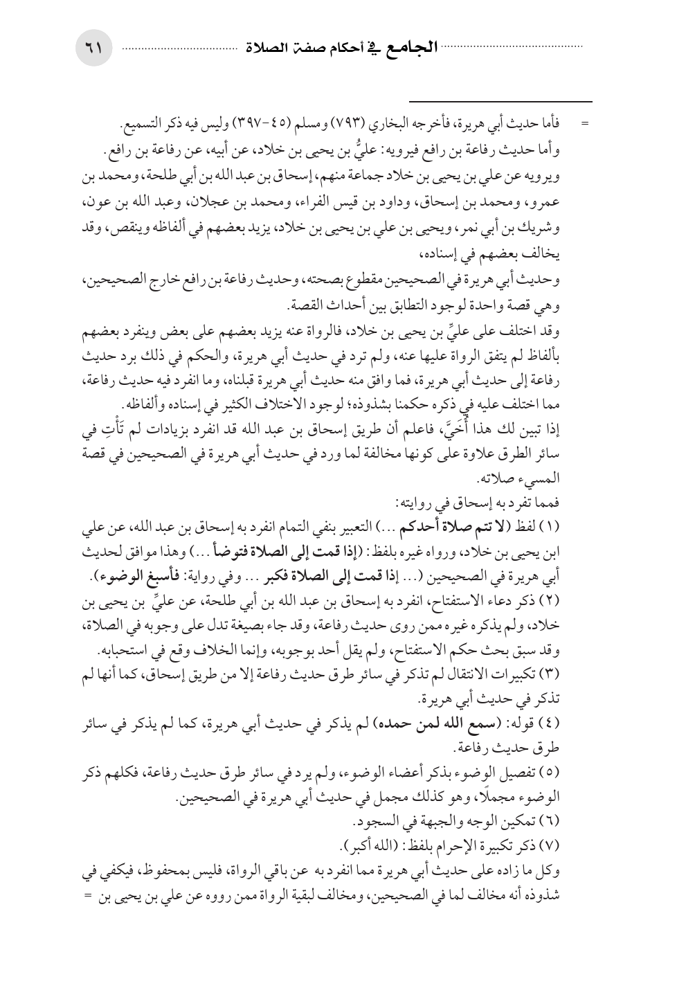 (٥) تفصيل الوضوء بذكر أعضاء الوضوء، ولم يرد في سائر طرق حديث رفاعة، فكلهم ذكر الوضوء مجملًا، وهو كذلك مجمل في حديث أبي هريرة في الصحيحين.