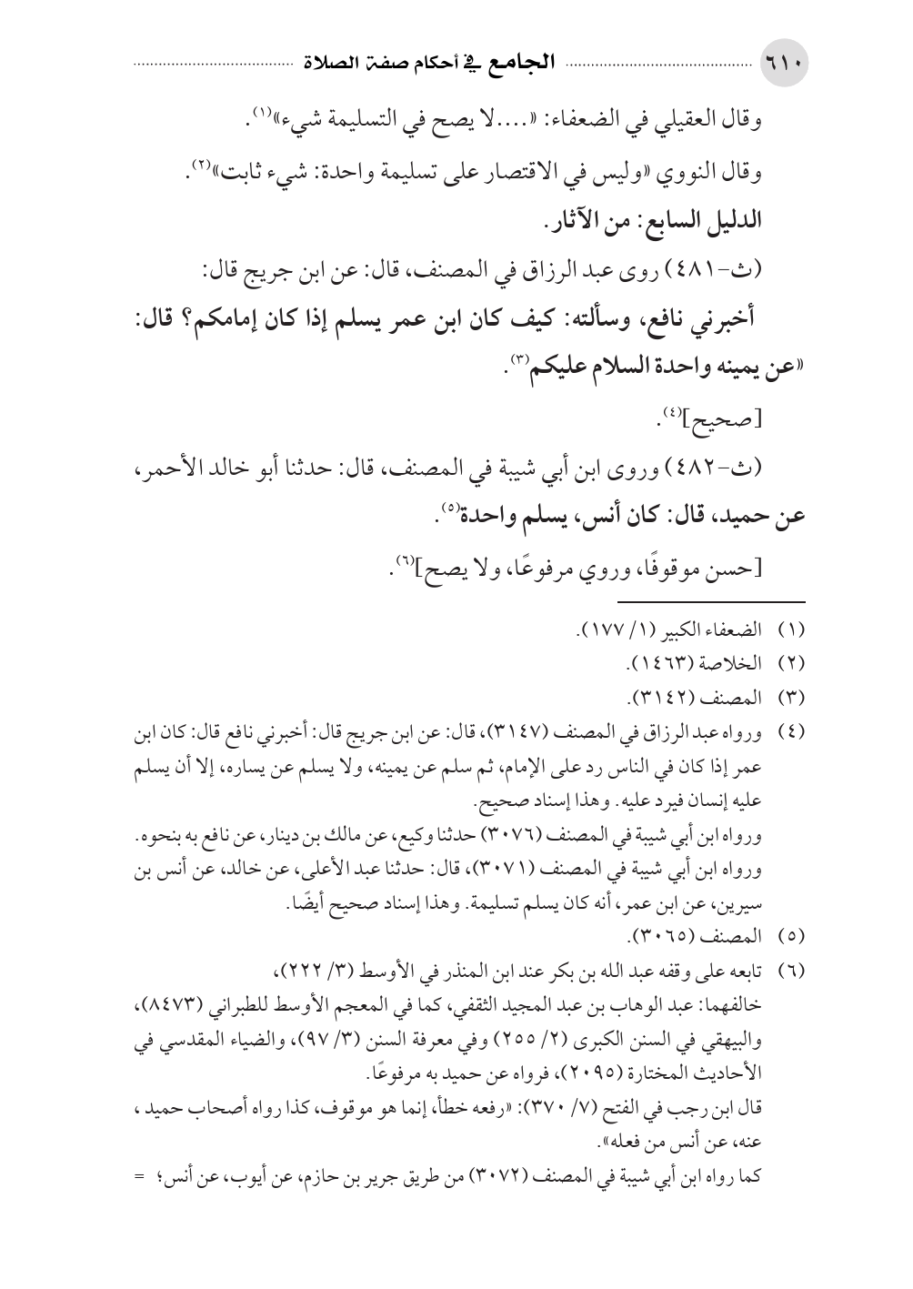 (¬٤). ورواه عبد الرزاق في المصنف (٣١٤٧)، قال: عن ابن جريج قال: أخبرني نافع قال: كان ابن عمر إذا كان في الناس رد على الإمام، ثم سلم عن يمينه، ولا يسلم عن يساره، إلا أن يسلم عليه إنسان فيرد عليه. وهذا إسناد صحيح.