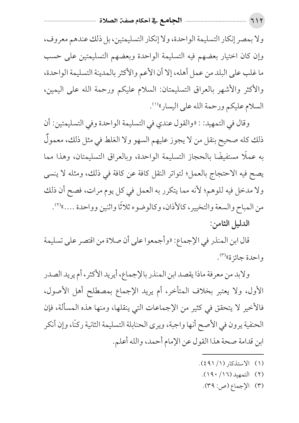 ولابد من معرفة ماذا يقصد ابن المنذر بالإجماع، أيريد الأكثر، أم يريد الصدر الأول، ولا يعتبر بخلاف المتأخر، أم يريد الإجماع بمصطلح أهل الأصول، فالأخير لا يتحقق في كثير من الإجماعات التي ينقلها، ومنها هذه المسألة، فإن الحنفية يرون في الأصح أنها واجبة، ويرى الحنابلة التسليمة الثانية ركنًا، وإن أنكر ابن قدامة صحة هذا القول عن الإمام أحمد، والله أعلم.