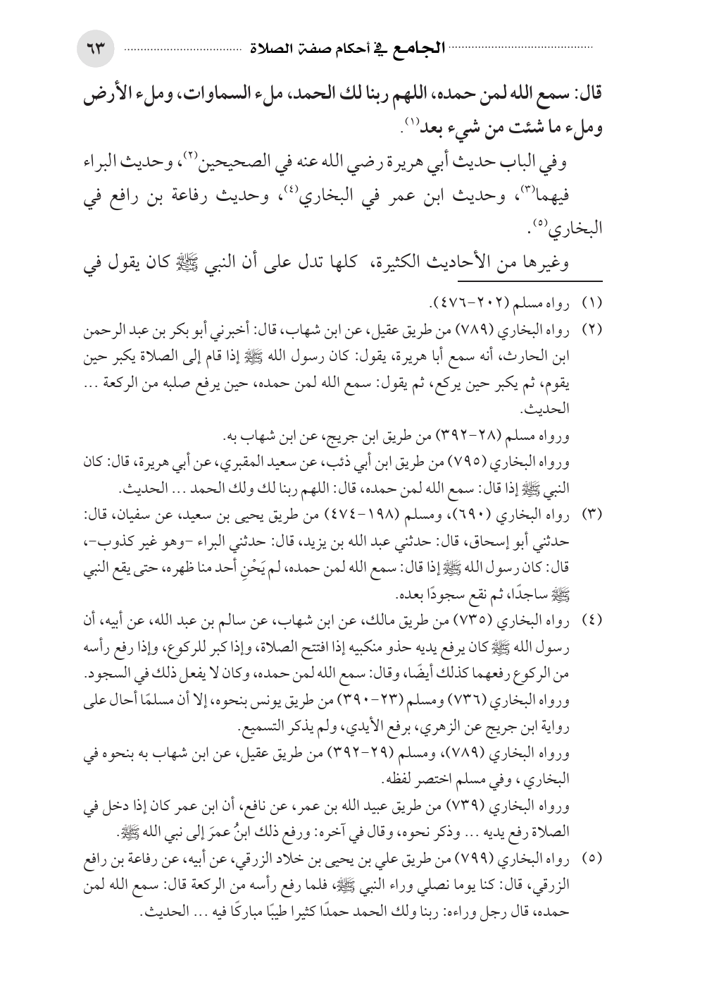 (¬٥). رواه البخاري (٧٩٩) من طريق علي بن يحيى بن خلاد الزرقي، عن أبيه، عن رفاعة بن رافع الزرقي، قال: كنا يوما نصلي وراء النبي - صلى الله عليه وسلم -، فلما رفع رأسه من الركعة قال: سمع الله لمن حمده، قال رجل وراءه: ربنا ولك الحمد حمدًا كثيرا طيبًا مباركًا فيه ... الحديث.