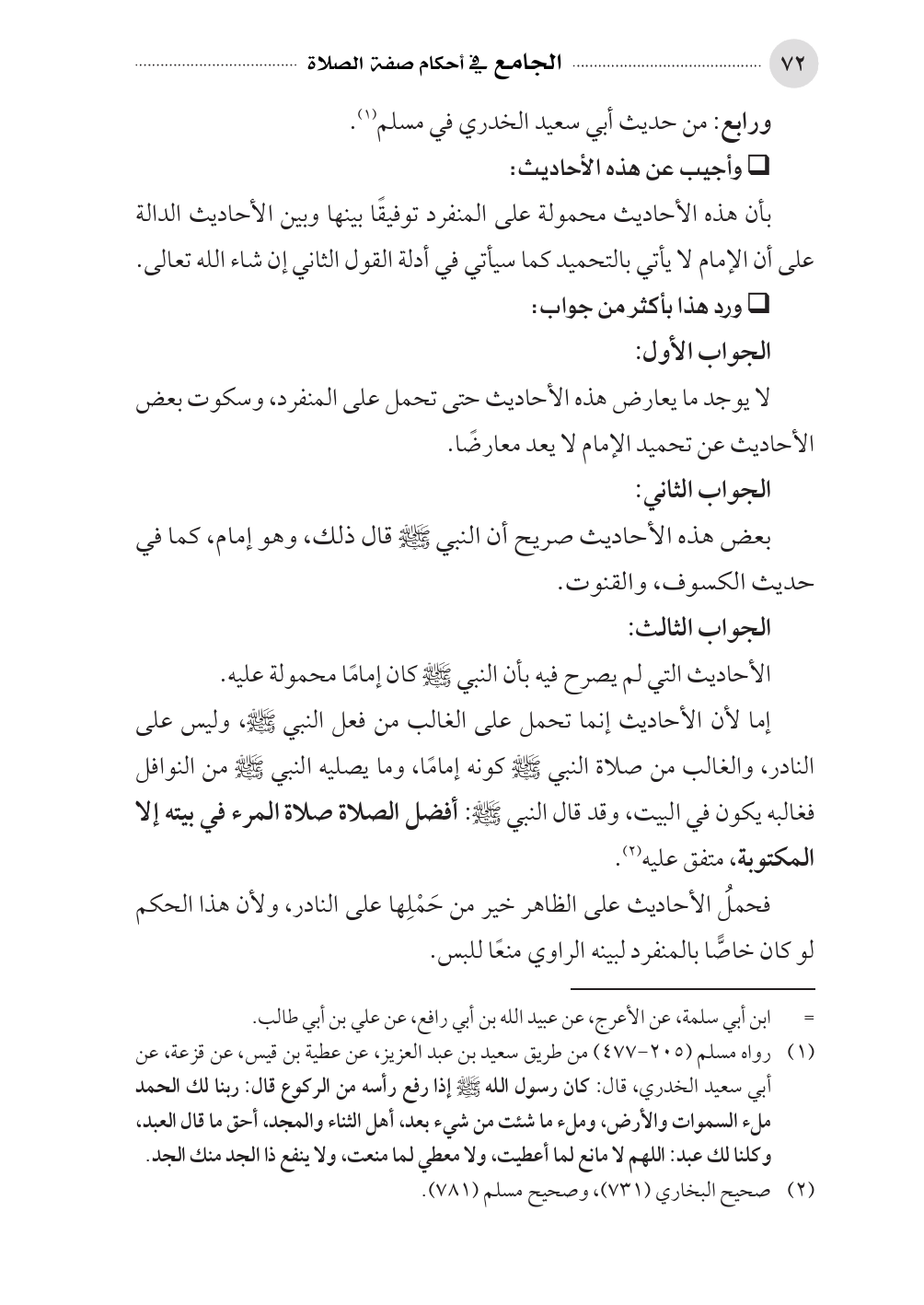 إما لأن الأحاديث إنما تحمل على الغالب من فعل النبي - صلى الله عليه وسلم -، وليس على النادر، والغالب من صلاة النبي - صلى الله عليه وسلم - كونه إمامًا، وما يصليه النبي - صلى الله عليه وسلم - من النوافل فغالبه يكون في البيت، وقد قال النبي - صلى الله عليه وسلم -: أفضل الصلاة صلاة المرء في بيته إلا المكتوبة، متفق عليه (¬٢).
