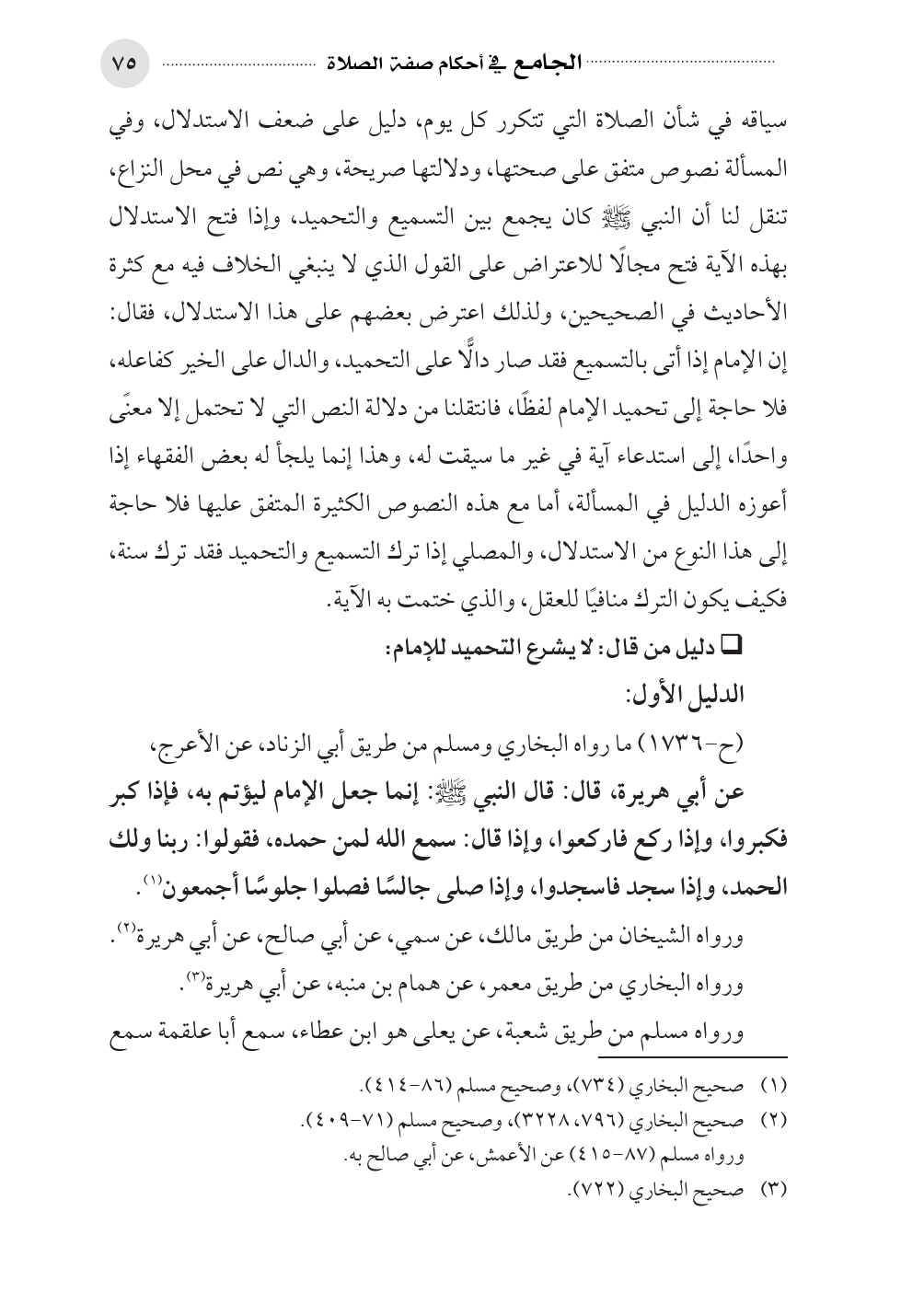 سياقه في شأن الصلاة التي تتكرر كل يوم، دليل على ضعف الاستدلال، وفي المسألة نصوص متفق على صحتها، ودلالتها صريحة، وهي نص في محل النزاع، تنقل لنا أن النبي - صلى الله عليه وسلم - كان يجمع بين التسميع والتحميد، وإذا فتح الاستدلال بهذه الآية فتح مجالًا للاعتراض على القول الذي لا ينبغي الخلاف فيه مع كثرة الأحاديث في الصحيحين، ولذلك اعترض بعضهم على هذا الاستدلال، فقال: إن الإمام إذا أتى بالتسميع فقد صار دالًّا على التحميد، والدال على الخير كفاعله، فلا حاجة إلى تحميد الإمام لفظًا، فانتقلنا من دلالة النص التي لا تحتمل إلا معنًى واحدًا، إلى استدعاء آية في غير ما سيقت له، وهذا إنما يلجأ له بعض الفقهاء إذا أعوزه الدليل في المسألة، أما مع هذه النصوص الكثيرة المتفق عليها فلا حاجة إلى هذا النوع من الاستدلال، والمصلي إذا ترك التسميع والتحميد فقد ترك سنة، فكيف يكون الترك منافيًا للعقل، والذي ختمت به الآية.