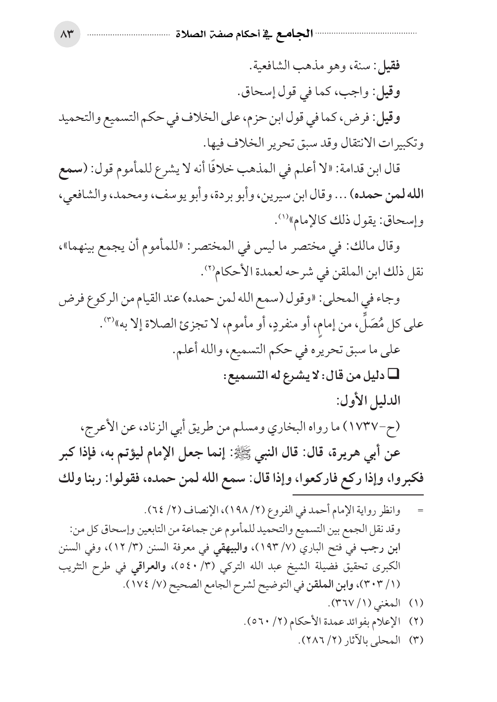 وجاء في المحلى: «وقول (سمع الله لمن حمده) عند القيام من الركوع فرض على كل مُصَلٍّ، من إمامٍ، أو منفردٍ، أو مأموم، لا تجزئ الصلاة إلا به» (¬٣).