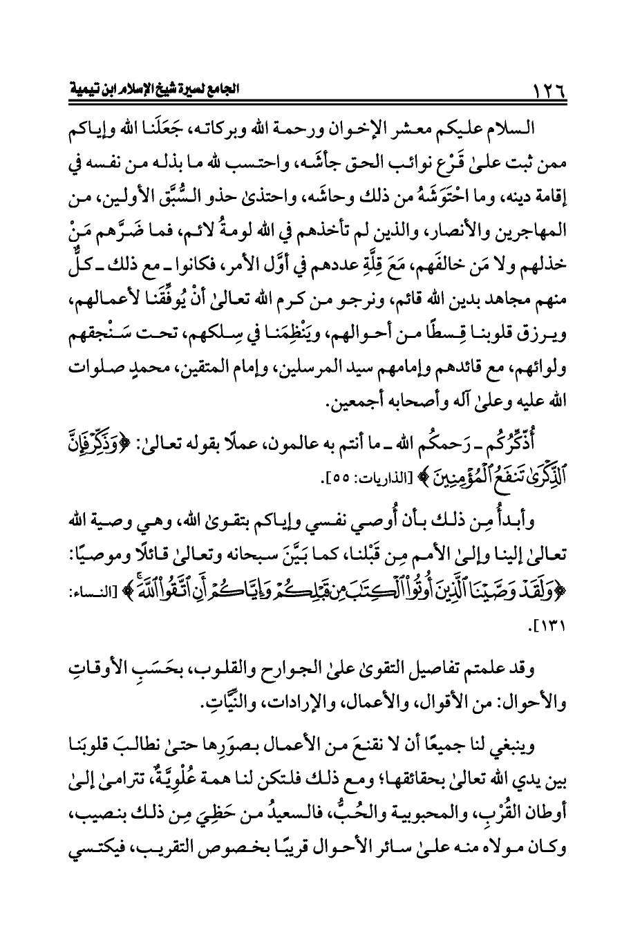 السلام عليكم معشر الإخوان ورحمة الله وبركاته، جَعَلَنا الله وإياكم ممن ثبت على قَرْع نوائب الحق جأشَه، واحتسب لله ما بذله من نفسه في إقامة دينه، وما احْتَوَشَهُ من ذلك وحاشَه، واحتذى حذو السُّبَّق الأولين، من المهاجرين والأنصار، والذين لم تأخذهم في الله لومةُ لائم، فما ضَرَّهم مَنْ خذلهم ولا مَن خالفَهم، مَعَ قِلَّةِ عددهم في أوَّل الأمر، فكانوا ــ مع ذلك ــ كلٌّ منهم مجاهد بدين الله قائم، ونرجو من كرم الله تعالى أنْ يُوفِّقَنا لأعمالهم، ويرزق قلوبنا قِسطًا من أحوالهم، ويَنْظِمَنا في سِلكهم، تحت سَنْجقهم ولوائهم، مع قائدهم وإمامهم سيد المرسلين، وإمام المتقين، محمدٍ صلوات الله عليه وعلى آله وأصحابه أجمعين.