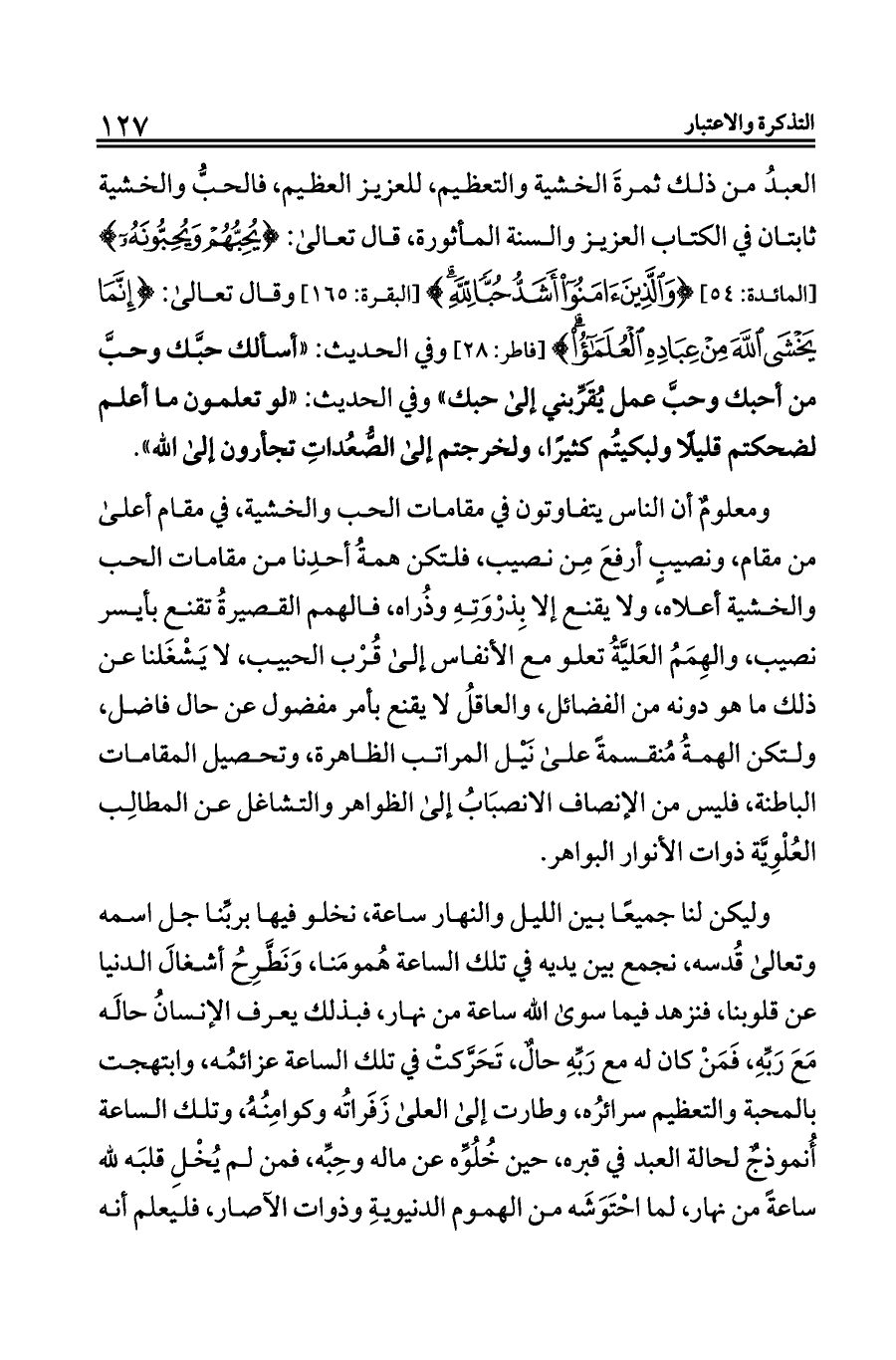 العبدُ من ذلك ثمرةَ الخشية والتعظيم، للعزيز العظيم، فالحبُّ والخشية ثابتان في الكتاب العزيز والسنة المأثورة، قال تعالى: {بِقَوْمٍ يُحِبُّهُمْ} [المائدة: ٥٤] {وَالَّذِينَ آمَنُوا أَشَدُّ حُبًّا لِلَّهِ} [البقرة: ١٦٥] وقال تعالى: {إِنَّمَا يَخْشَى اللَّهَ مِنْ عِبَادِهِ الْعُلَمَاءُ} [فاطر: ٢٨] وفي الحديث: «أسألك حبَّك وحبَّ من أحبك وحبَّ عمل يُقَرِّبني إلى حبك» وفي الحديث: «لو تعلمون ما أعلم لضحكتم قليلًا ولبكيتُم كثيرًا، ولخرجتم إلى الصُّعُداتِ تجأرون إلى الله».