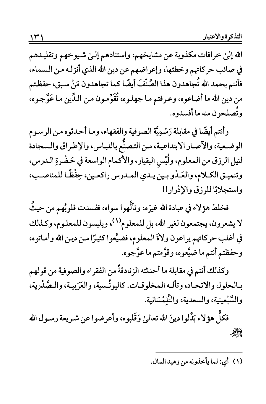 وأنتم أيضًا في مقابلة رَسْمِيَّة الصوفية والفقهاء، وما أحدثوه من الرسوم الوضعية، والآصار الابتداعية، من التصنُّع باللباس، والإطراق والسجادة لنيل الرزق من المعلوم، ولُبْسِ البقيار، والأكمام الواسعة في حَضْرةِ الدرس، وتنميق الكلام، والعَدْو بين يدي المدرس راكعين، حِفْظًا للمناصب، واستجلابًا للرزق والإدْرار! !