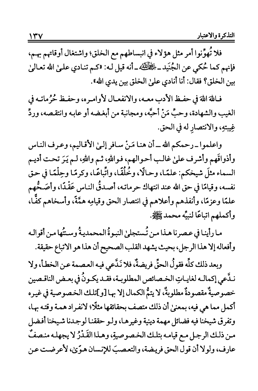فلا تُهوِّنوا أمر مثل هؤلاء في انبساطهم مع الخلق؛ واشتغال أوقاتهم بهم، فإنهم كما حُكي عن الجُنَيد - رحمه الله - أنه قيل له: «كم تنادي على الله تعالى بين الخلق؟ فقال: أنا أنادي على الخلق بين يدي الله».