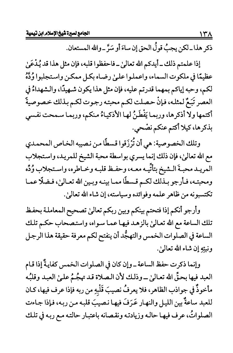 وتلك الخصوصية: هي أن تُرْزَقوا قسطًا من نصيبه الخاص المحمدي مع الله تعالى، فإن ذلك إنما يسري بواسطة محبة الشيخ للمريد، واستجلاب المريد محبةَ الشيخ بتأتِّيه معه، وحفظ قلبه وخاطره، واستجلاب وُدِّه ومحبته، فأرجو بذلك لكم قسطًا مما بينه وبين الله تعالى، فضلًا عما تكتسبونه من ظاهر علمه وفوائده وسياسته، إن شاء الله تعالى.