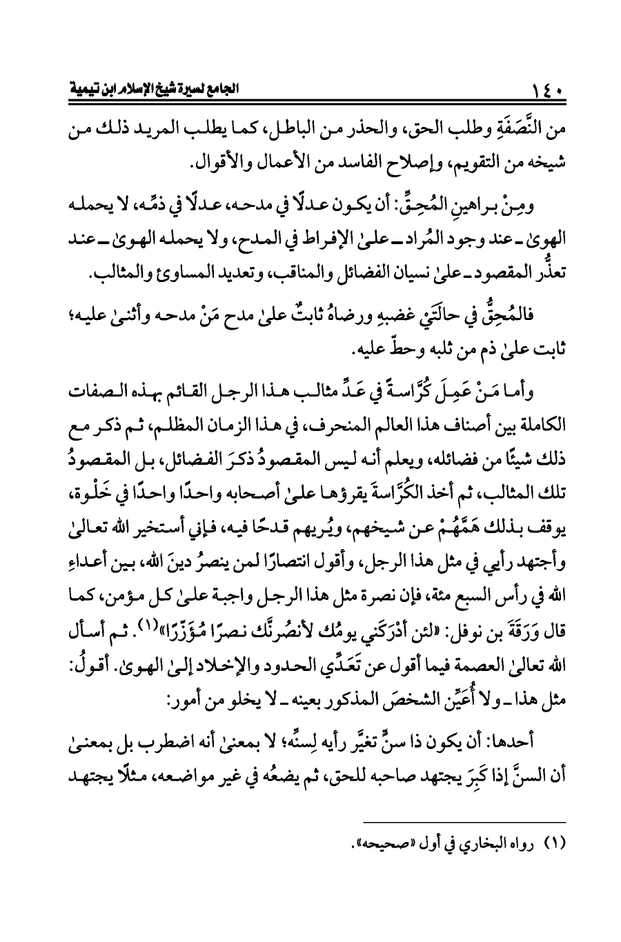 ومِنْ براهينِ المُحِقِّ: أن يكون عدلًا في مدحه، عدلًا في ذمِّه، لا يحمله الهوى ــ عند وجود المُراد ــ على الإفراط في المدح، ولا يحمله الهوى ــ عند تعذُّر المقصود ــ على نسيان الفضائل والمناقب، وتعديد المساوئ والمثالب.
