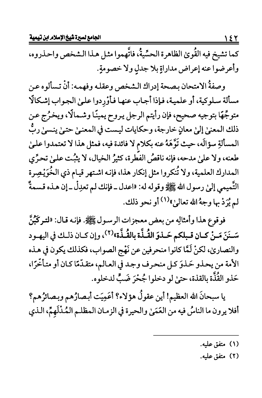 وصفةُ الامتحان بصحة إدراك الشخص وعقله وفهمه: أنْ تسألوه عن مسألة سلوكية، أو علمية، فإذا أجاب عنها فأوْرِدوا على الجواب إشكالًا متوجِّهًا بتوجيه صحيح، فإن رأيتم الرجل يروح يمينًا وشمالًا، ويخرُج عن ذلك المعنى إلى معانٍ خارجة، وحكايات ليست في المعنى حتى ينسى ربُّ المسألةِ سؤالَه، حيث تَوَّهَهُ عنه بكلامٍ لا فائدة فيه، فمثل هذا لا تعتمدوا على طعنه، ولا على مدحه، فإنه ناقصُ الفطرة، كثيرُ الخيال، لا يثبُت على تحرِّي المدارك العلمية، ولا تُنكروا مثل إنكار هذا، فإنه اشتهر قيام ذي الخُوَيْصِرة التَّميمي إلى رسول الله - صلى الله عليه وسلم - وقوله له: «اعدل ــ فإنك لم تعدِلْ ــ إن هذه قسمةٌ لم يُرَدْ بها وجهُ الله تعالى» (¬١) أو نحو ذلك.