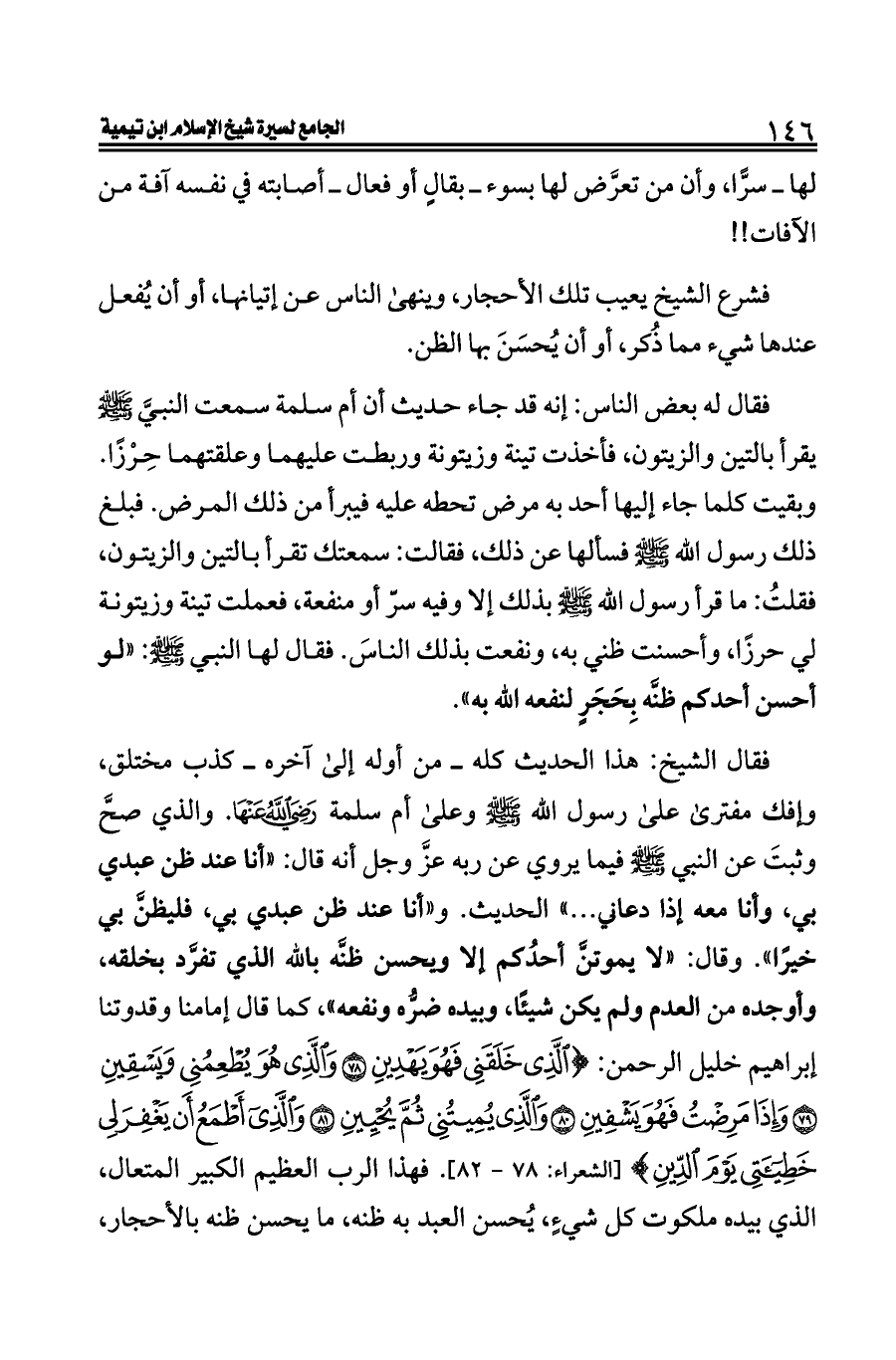 فقال الشيخ: هذا الحديث كله ــ من أوله إلى آخره ــ كذب مختلق، وإفك مفترى على رسول الله - صلى الله عليه وسلم - وعلى أم سلمة - رضي الله عنها -. والذي صحَّ وثبتَ عن النبي - صلى الله عليه وسلم - فيما يروي عن ربه عزَّ وجل أنه قال: «أنا عند ظن عبدي بي، وأنا معه إذا دعاني ... » الحديث. و «أنا عند ظن عبدي بي، فليظنَّ بي خيرًا». وقال: «لا يموتنَّ أحدُكم إلا ويحسن ظنَّه بالله الذي تفرَّد بخلقه، وأوجده من العدم ولم يكن شيئًا، وبيده ضرُّه ونفعه»، كما قال إمامنا وقدوتنا إبراهيم خليل الرحمن: {الَّذِي خَلَقَنِي فَهُوَ يَهْدِينِ (٧٨) وَالَّذِي هُوَ يُطْعِمُنِي وَيَسْقِينِ (٧٩) وَإِذَا مَرِضْتُ فَهُوَ يَشْفِينِ (٨٠) وَالَّذِي يُمِيتُنِي ثُمَّ يُحْيِينِ (٨١) وَالَّذِي أَطْمَعُ أَنْ يَغْفِرَ لِي خَطِيئَتِي يَوْمَ الدِّينِ} [الشعراء: ٧٨ - ٨٢]. فهذا الرب العظيم الكبير المتعال، الذي بيده ملكوت كل شيءٍ، يُحسن العبد به ظنه، ما يحسن ظنه بالأحجار،