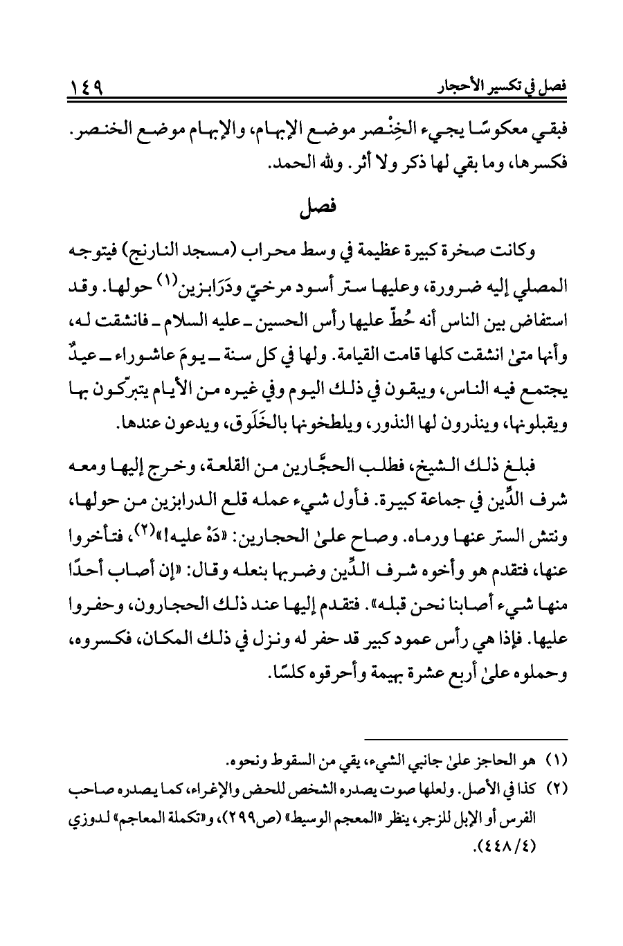 وكانت صخرة كبيرة عظيمة في وسط محراب (مسجد النارنج) فيتوجه المصلي إليه ضرورة، وعليها ستر أسود مرخيّ ودَرَابزين (¬١) حولها. وقد استفاض بين الناس أنه حُطّ عليها رأس الحسين ــ عليه السلام ــ فانشقت له، وأنها متى انشقت كلها قامت القيامة. ولها في كل سنة ــ يومَ عاشوراء ــ عيدٌ يجتمع فيه الناس، ويبقون في ذلك اليوم وفي غيره من الأيام يتبرّكون بها ويقبلونها، وينذرون لها النذور، ويلطخونها بالخَلَوق، ويدعون عندها.