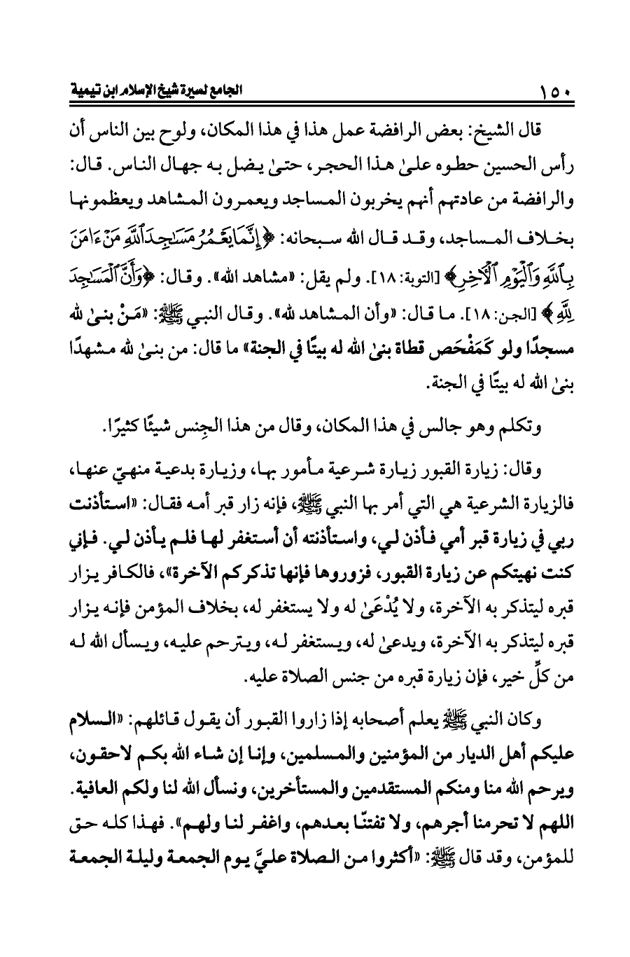 قال الشيخ: بعض الرافضة عمل هذا في هذا المكان، ولوح بين الناس أن رأس الحسين حطوه على هذا الحجر، حتى يضل به جهال الناس. قال: والرافضة من عادتهم أنهم يخربون المساجد ويعمرون المشاهد ويعظمونها بخلاف المساجد، وقد قال الله سبحانه: {إِنَّمَا يَعْمُرُ مَسَاجِدَ اللَّهِ مَنْ آمَنَ بِاللَّهِ وَالْيَوْمِ الْآخِرِ} [التوبة: ١٨]. ولم يقل: «مشاهد الله». وقال: {وَأَنَّ الْمَسَاجِدَ لِلَّهِ} [الجن: ١٨]. ما قال: «وأن المشاهد لله». وقال النبي - صلى الله عليه وسلم -: «مَنْ بنى لله مسجدًا ولو كَمَفْحَص قطاة بنى الله له بيتًا في الجنة» ما قال: من بنى لله مشهدًا بنى الله له بيتًا في الجنة.
