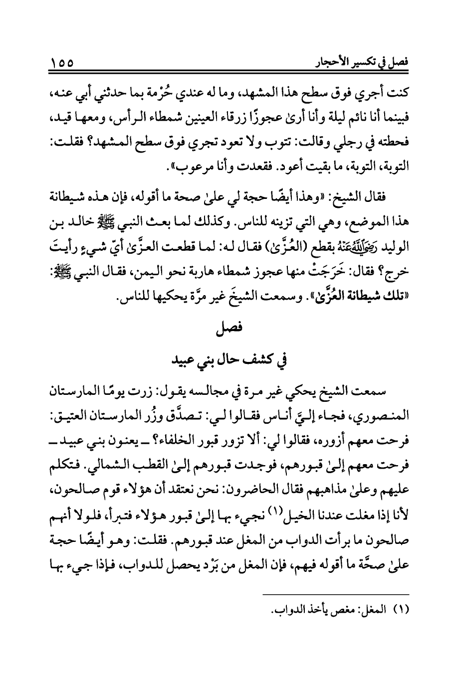 فقال الشيخ: «وهذا أيضًا حجة لي على صحة ما أقوله، فإن هذه شيطانة هذا الموضع، وهي التي تزينه للناس. وكذلك لما بعث النبي - صلى الله عليه وسلم - خالد بن الوليد - رضي الله عنه - بقطع (العُزَّى) فقال له: لما قطعت العزَّى أيّ شيءٍ رأيتَ خرج؟ فقال: خَرَجَتْ منها عجوز شمطاء هاربة نحو اليمن، فقال النبي - صلى الله عليه وسلم -: «تلك شيطانة العُزَّى». وسمعت الشيخَ غير مرَّة يحكيها للناس.